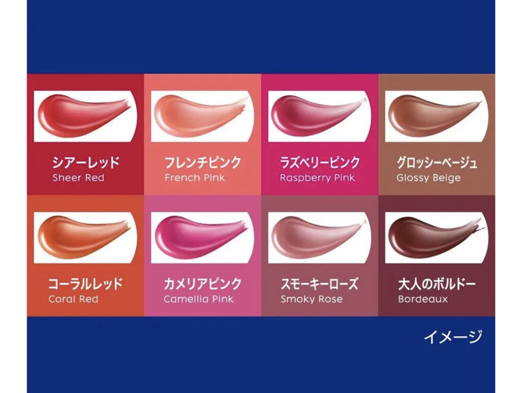 リッチなうるおいに、透明感のある艶やかな発色。 ケアしながら、色づき・艶めく、ふっくらとした唇にみせる。 3つの美容オイル成分*(保湿)配合 つけた瞬間、体温でとろけてうるおいが唇をしっかり包みこむ! ケアしながら、透明感のある高発色が実現。 ファッションや気分、シーンに合わせて選べる8つのカラー