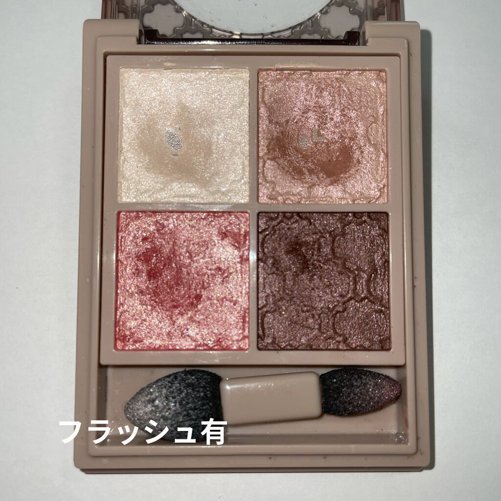 パッケージが可愛い! 上質なツヤめきとクリアな発色がとけこみ、大人のうるみ目を叶える4 色セットアイカラーです。 しっとりタッチのクリーミィベース×3 色のグラデーションカラーで印象的な目もとに仕上げます。 ベタつきのないクリーミィなオイルを配合。肌にとけこむような心地よい使用感です。 白膜感を感じさせない粉体を厳選。にごりのないクリアな発色を叶えます。 オフィスメイクや大人っぽいメイクをしたい時にピッタリなアイシャドウだと思います。 ラメ飛びが結構気になったのが残念ポイントでした💦