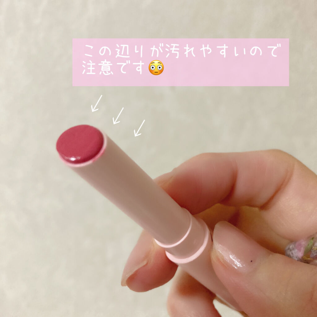 色味🐰🍁🍂赤よりも少しまろやかさを感じ、ブラウンでありながら体温を感じる、絶妙なカラーです☺️♡ 塗り心地🐰🍁🍂リップクリームのように、柔らかくするすると塗れます💡そして、全く乾燥しない😳!!塗りたては、程よく艶が出て本当に美しい仕上がり…🥺💓 色モチ🐰🍁🍂何もしないで2〜3時間程、マスクの着脱や飲食等をすれば1〜2時間くらいだと思います👀💡ティントではないので、普通に飲食をしたら落ちてしまいます😓保湿力が高く油分が多いためか、マスクやコップへの色移りは結構ありました🙇♂️