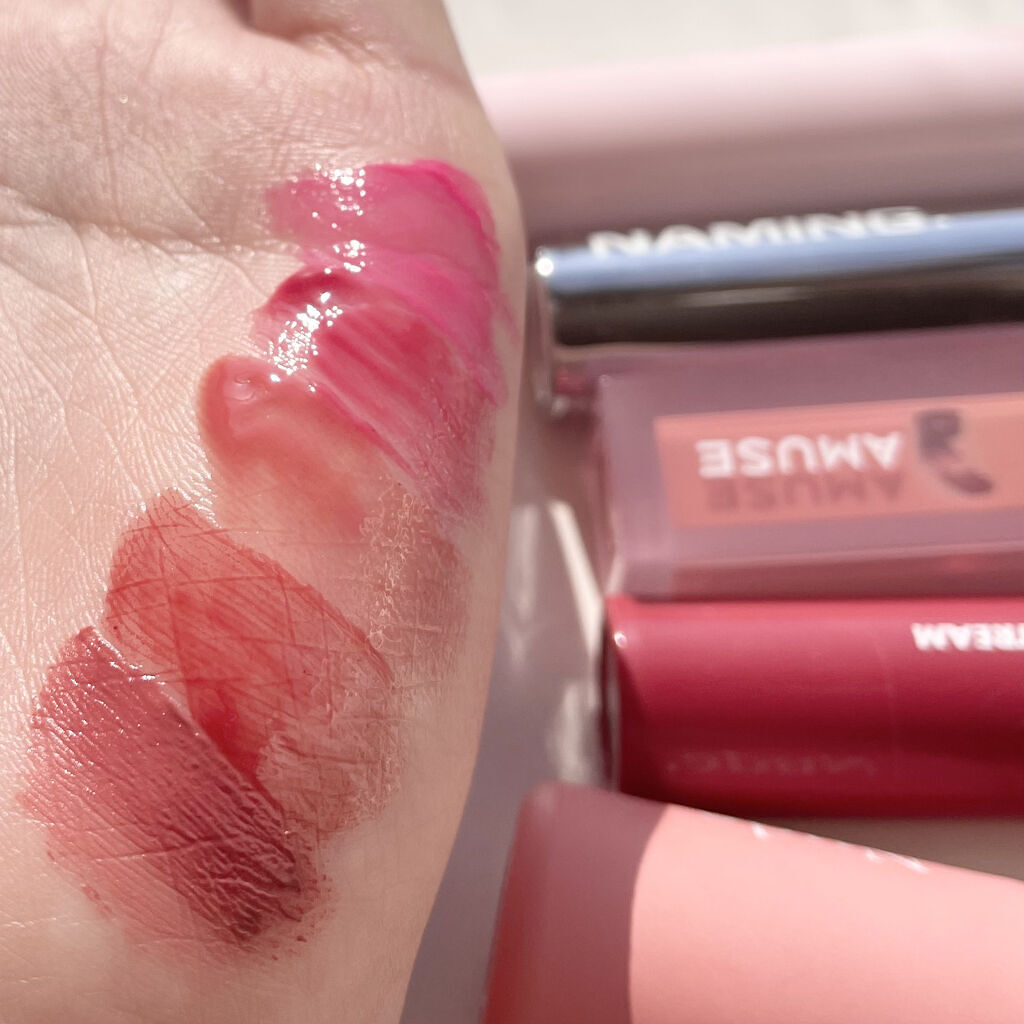 INTO U スーパーマットリップ&チークマッド EM10 クイーンローズティー ¥1430- PERIPERA インク ベルベット 26WELL-MADE NUDE ¥850- rom&nd グラスティングウォーターティント #08 ローズ ストリーム ¥1320- rom&nd ジューシーラスティングティント #13 EAT DOTORI ¥1320- AMUSE NEW デューティント 08春の夜 ¥2200- AMUSE NEW デューティント 11桃 ¥2200-