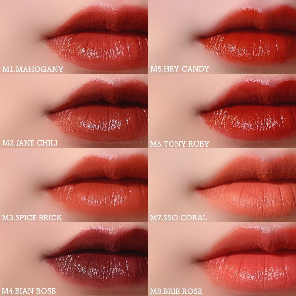- <M1 マホガニー> ジメチコン、(ジメチコン/ビニルジメチコン)クロスポリマー、水、グリセリン、トリイソステアリン酸ポリグリセリル-2、セチルPEG/PPG-10/1ジメチコン、シクロペンタシロキサン、ペンチレングリコール、メチルトリメチコン、リンゴ酸ジイソステアリル、(アクリル酸ブチル/アクリル酸ヒドロキシプロピルジメチコン)コポリマー、イソドデカン、フェノキシエタノール、トリメチルシロキシケイ酸、(アクリル酸グリセリル/アクリル酸)コポリマー、マイカ、シリカ、ポリプロピルシルセスキオキサン、カプリリルグリコール、1,2-ヘキサンジオール、プロパンジオール、香料、エチルヘキシルグリセリン、水酸化Al、ジメチルシリル化シリカ、ダイウイキョウ果実エキス、メチコン、ヤシ油、アルガニアスピノサ核油、ワサビノキ種子油、シア脂、ハチミツエキス、BG、酸化チタン、酸化鉄、赤104(1)、赤202、黄5、青1 <M2 ジェインチリー> ジメチコン、(ジメチコン/ビニルジメチコン)クロスポリマー、水、グリセリン、トリイソステアリン酸ポリグリセリル-2、セチルPEG/PPG-10/1ジメチコン、シクロペンタシロキサン、ペンチレングリコール、リンゴ酸ジイソステアリル、メチルトリメチコン、(アクリル酸ブチル/アクリル酸ヒドロキシプロピルジメチコン)コポリマー、イソドデカン、フェノキシエタノール、トリメチルシロキシケイ酸、(アクリル酸グリセリル/アクリル酸)コポリマー、マイカ、シリカ、ポリプロピルシルセスキオキサン、カプリリルグリコール、1,2-ヘキサンジオール、香料、プロパンジオール、エチルヘキシルグリセリン、水酸化Al、ジメチルシリル化シリカ、ダイウイキョウ果実エキス、メチコン、ワサビノキ種子油、シア脂、ヤシ油、アルガニアスピノサ核油、ハチミツエキス、BG、酸化チタン、酸化鉄、赤104(1)、赤202、黄4、黄5、青1 <M3 スパイスブリック> ジメチコン、(ジメチコン/ビニルジメチコン)クロスポリマー、水、グリセリン、トリイソステアリン酸ポリグリセリル-2、セチルPEG/PPG-10/1ジメチコン、シクロペンタシロキサン、ペンチレングリコール、メチルトリメチコン、(アクリル酸ブチル/アクリル酸ヒドロキシプロピルジメチコン)コポリマー、イソドデカン、フェノキシエタノール、トリメチルシロキシケイ酸、(アクリル酸グリセリル/アクリル酸)コポリマー、マイカ、シリカ、ポリプロピルシルセスキオキサン、カプリリルグリコール、リンゴ酸ジイソステアリル、1,2-ヘキサンジオール、香料、プロパンジオール、水酸化Al、エチルヘキシルグリセリン、ジメチルシリル化シリカ、ダイウイキョウ果実エキス、メチコン、ワサビノキ種子油、シア脂、ヤシ油、アルガニアスピノサ核油、ハチミツエキス、BG、酸化チタン、酸化鉄、赤104(1)、黄4、黄5 <M4 ビアンローズ> ジメチコン、(ジメチコン/ビニルジメチコン)クロスポリマー、水、グリセリン、セチルPEG/PPG-10/1ジメチコン、トリイソステアリン酸ポリグリセリル-2、シクロペンタシロキサン、リンゴ酸ジイソステアリル、ペンチレングリコール、メチルトリメチコン、(アクリル酸ブチル/アクリル酸ヒドロキシプロピルジメチコン)コポリマー、イソドデカン、フェノキシエタノール、トリメチルシロキシケイ酸、(アクリル酸グリセリル/アクリル酸)コポリマー、マイカ、シリカ、ポリプロピルシルセスキオキサン、カプリリルグリコール、1,2-ヘキサンジオール、香料、プロパンジオール、エチルヘキシルグリセリン、水酸化Al、ジメチルシリル化シリカ、ダイウイキョウ果実エキス、メチコン、ワサビノキ種子油、シア脂、ヤシ油、アルガニアスピノサ核油、ハチミツエキス、BG、酸化チタン、酸化鉄、赤202、赤227、黄4、青1 <M5 ヘイキャンディー> ジメチコン、(ジメチコン/ビニルジメチコン)クロスポリマー、水、グリセリン、トリイソステアリン酸ポリグリセリル-2、セチルPEG/PPG-10/1ジメチコン、シクロペンタシロキサン、ペンチレングリコール、メチルトリメチコン、(アクリル酸ブチル/アクリル酸ヒドロキシプロピルジメチコン)コポリマー、イソドデカン、フェノキシエタノール、トリメチルシロキシケイ酸、リンゴ酸ジイソステアリル、(アクリル酸グリセリル/アクリル酸)コポリマー、マイカ、シリカ、ポリプロピルシルセスキオキサン、カプリリルグリコール、1,2-ヘキサンジオール、プロパンジオール、香料、エチルヘキシルグリセリン、ジメチルシリル化シリカ、ダイウイキョウ果実エキス、メチコン、アルガニアスピノサ核油、シア脂、ヤシ油、ワサビノキ種子油、ハチミツエキス、BG、酸化鉄、赤104(1)、赤202、黄5 <M6 トニールビー> ジメチコン、(ジメチコン/ビニルジメチコン)クロスポリマー、水、グリセリン、トリイソステアリン酸ポリグリセリル-2、セチルPEG/PPG-10/1ジメチコン、シクロペンタシロキサン、ペンチレングリコール、メチルトリメチコン、(アクリル酸ブチル/アクリル酸ヒドロキシプロピルジメチコン)コポリマー、