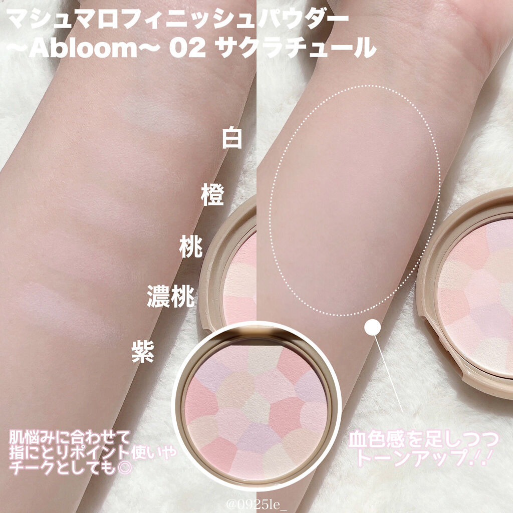- 長時間崩れにくい 澄んだマシュマロ肌仕上げのフィニッシュパウダー マシュマロフィニッシュパウダーのふわふわマットな仕上がりはそのまま、 ワントーンアップした透明美肌に仕上がるAbloomタイプ。 5色を混ぜて使うことで、顔色補正効果&トーンアップ! 濁りのない澄んだ肌が長時間続きます。 汗・皮脂崩れ・乾燥に強く、長時間メイク崩れを防止します。