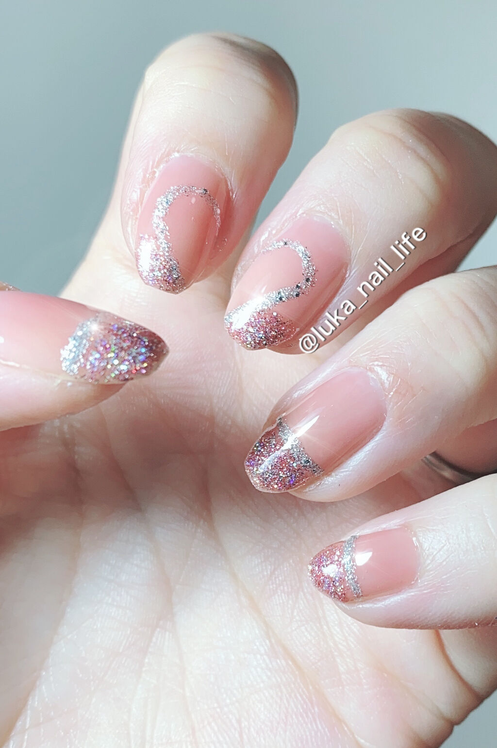 2021年のネイルデザインでバズってる、ガラスフレンチをやってみました💕とにかくキラキラが可愛い💎ファンデーションカラーズの透明感ある色と、純銀のホログラムの相性抜群でした😍✨是非参考にしてみて下さい💕①ラベンダーピンクを4度塗り❣️②フレン...