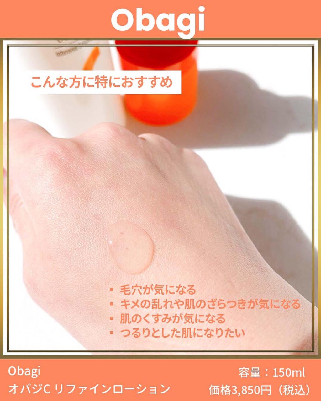 - <オバジC リファインローション> 水、エタノール、BG、グリセリン、DPG、アスコルビン酸、リン酸アスコルビルMg、フラーレン、アスコフィルムノドスムエキス、マクルラコチンチネンシス葉プレニルフラボノイド、ビワ葉エキス、チャ葉エキス、コンフリー葉エキス、プロパンジオール、クエン酸、クエン酸Na、PEG-60水添ヒマシ油、PEG-32、PPG-10メチルグルコース、コハク酸ジエトキシエチル、トレハロース、ポリアクリロイルジメチルタウリンNa、キサンタンガム、ポリソルベート60、ビオサッカリドガム-1、ジラウロイルグルタミン酸リシンNa、ソルビトール、t-ブタノール、PVP、EDTA-2Na、ピロ亜硫酸Na、香料