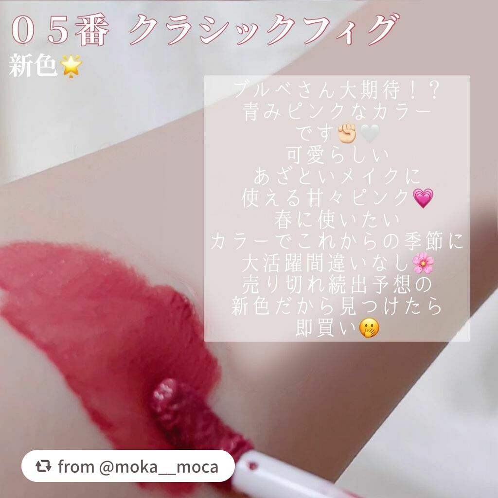 - ツヤ膜でLIPカラーを閉じ込める 塗ってから「5分」でかわいい唇完成♥ツヤがあふれ出るオイルinウォーターティント 水に対して約2倍のオイル成分を配合した「オイルinウォーター処方」 時間経過でツヤ膜がじゅわ~っとあふれ出し、 まるでグロスを重ねたような仕上がりに。みずみずしいツヤ感が持続します。 塗布後、時間経過(※)で色が定着して食べても飲んでも血色長持ち。 (※定着には個人差があります。弊社5分推奨) 高密着で唇に溶け込むように色づきます。 コップやペットボトルへの色移りがしにくくなります。