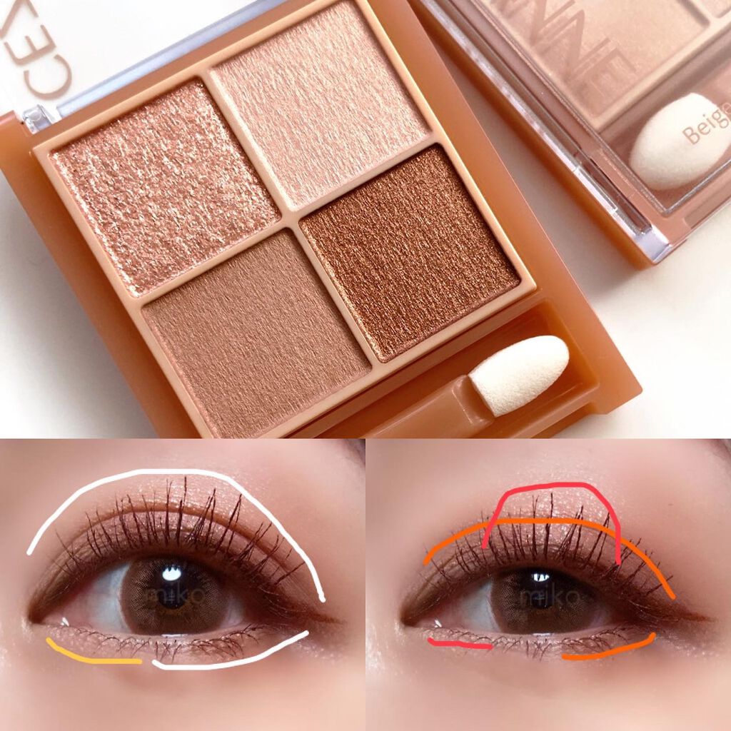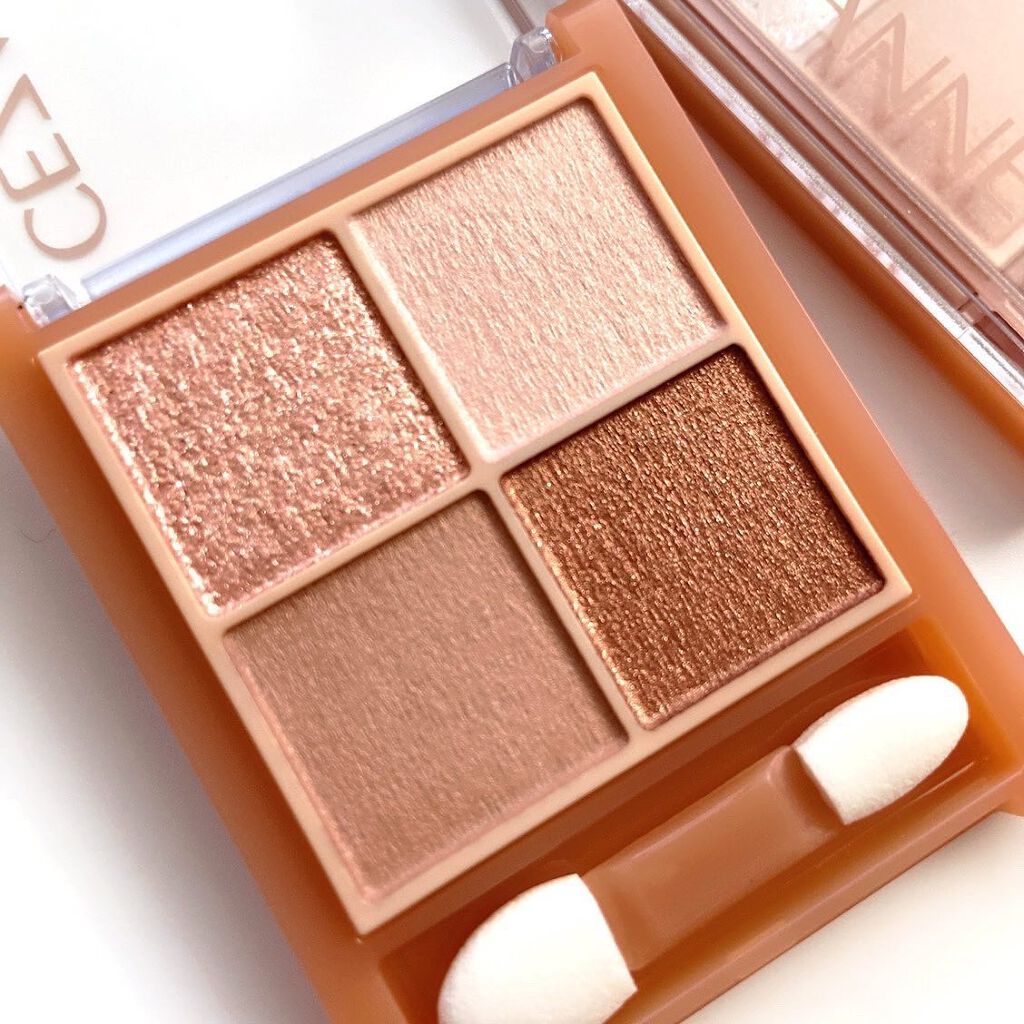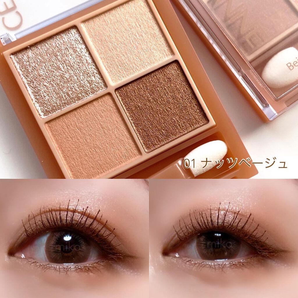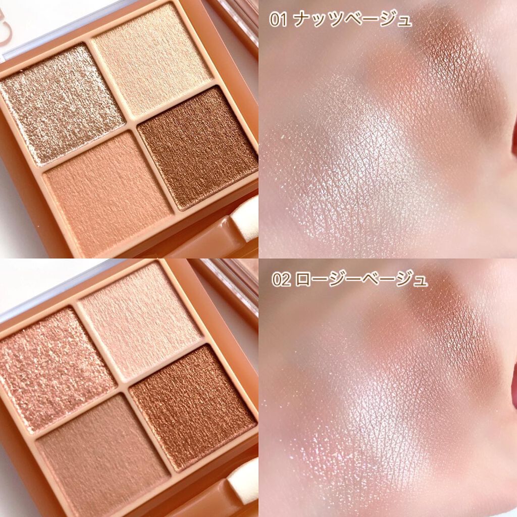 - ラメ・パール・マット3質感の4色アイシャドウ。 肌馴染みの良いベージュを基調としたカラー。ラメ・パール・マットの3質感を重ねて、自然にまぶたを強調し奥行のある大きな目元へ。 しっとり溶け込むような柔らかなパウダーなので、スルスル伸びてまぶたにピタッと密着。保湿成分(スクワラン・ホホバ種子油)配合。