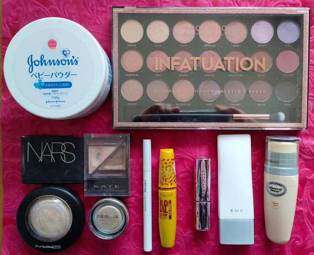 アリィー ニュアンスチェンジUV ジェル RSを、顔全体にまんべんなく塗ります。 RMK RMK ジェルクリーミィファンデーション 103を、顔全体にまんべんなく塗ります。 ジョンソンベビー ジョンソン ベビーパウダーを、顔全体にまんべんなく軽くはたきます。 THE BODY SHOP bronze shade warm glowを、両頬に塗ります。 KATE リフレクトミラーアイズ BR-1の締め色を、眉毛全体にまんべんなく塗ります。 URGLAM UR GLAMBLOOMING EYE COLOR PALETTE 01を、使用しました。 ちふれ リキッド アイライナー 筆ペンタイプ BK30 ブラックを、塗ります。 CEZANNE エアリーカールマスカラを、まつ毛全体にまんべんなく塗ります。 MAYBELLINE NEW YORK コロッサルボリュームエクスプレスを、まつ毛全体にまんべんなく塗ります。 MAYBELLINE NEW YORK SPステイ マットインク 135を、唇全体にまんべんなく塗ります。