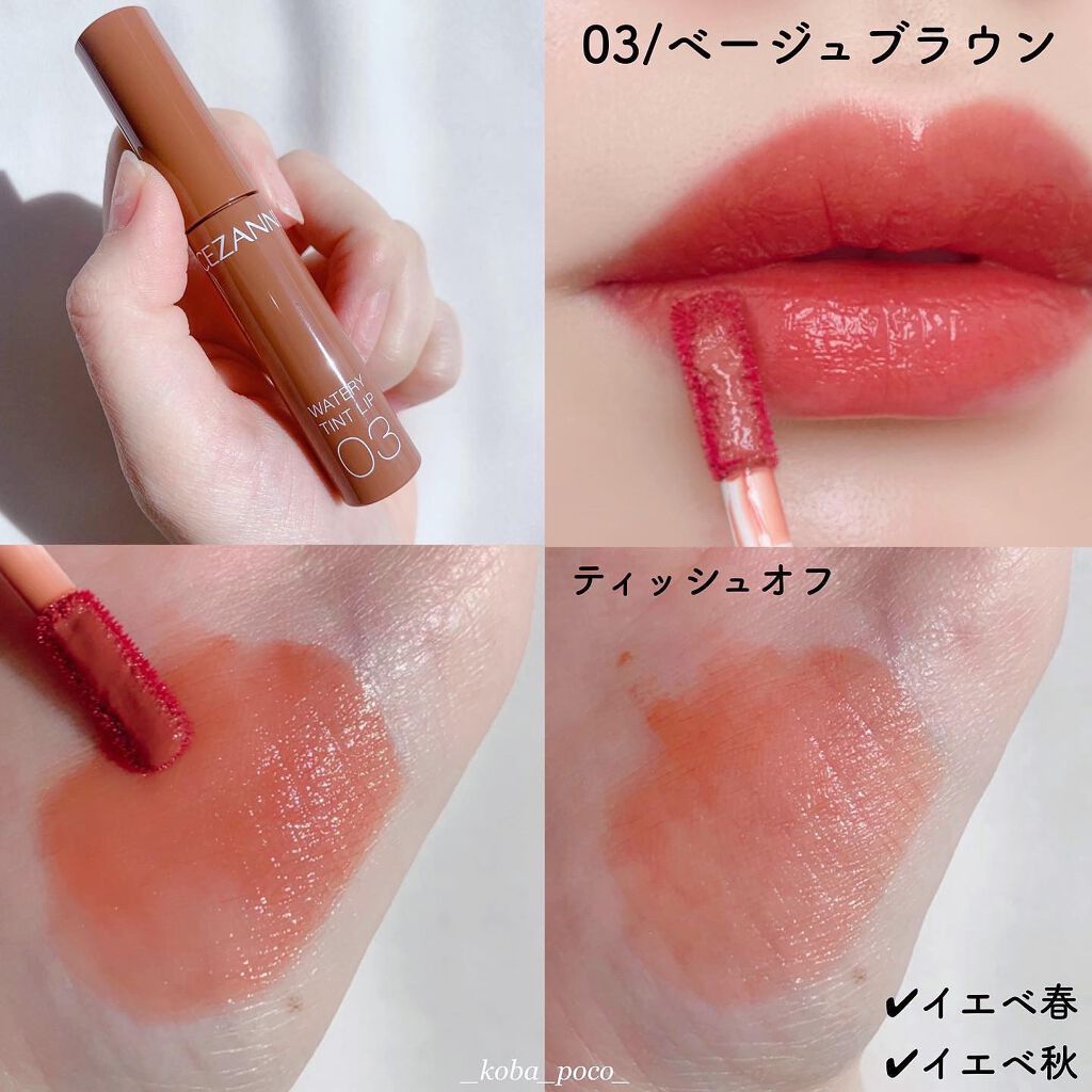 - ツヤ×色×潤いをキープする、セザンヌの新濡れツヤリップ みずみずしい濡れツヤ感ある仕上がりで、発色とツヤが長続きするティントリップです。ティントの発色を透明のベールで覆うリップコートのような処方で、ツヤ感と色をキープします。さらに、唇表面のべたつきは少なく、しっとり潤うオイルinウォーター処方を採用しています。