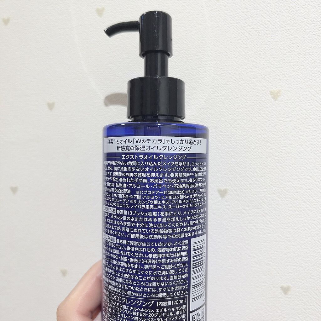 - 新感覚!保湿オイルクレンジング。 メイクはしっかり落したい、でもオイルクレンジングは肌の乾燥が気になるという方に、「Extra Oil Cleansing(エクストラオイルクレンジング)」は酵素が毛穴や角質のすき間に入り込んだメイクを角栓や古い角質とともに細かく分解し、オイルにさらっとなじませ落としやすくしてくれます。 また、肌の油分を取りすぎず、使用後の肌の乾燥を抑えてくれます。 美肌酵素・保湿成分・美容成分配合で使用後のお肌の乾燥を防ぎます。 <<ぬれた手や顔、お風呂でも使えます>> ●酵素※1が毛穴や古い角質に入り込んだメイクを浮かせ、さっとオイルとなじませる、肌に負担の少ないオイルクレンジングです。 ●肌の油分を取りすぎず、使用後のお肌の乾燥を抑えます。 ●美肌酵素※1・保湿成分※2・美容成分※3配合 ●ぬれた手や顔、お風呂でも使えます。 ●6つのフリー 香料・着色料・鉱物油・アルコール・パラベン・石油系界面活性剤不使用 ●独自の酵素安定化製法 ※1 プロテアーゼ(洗浄成分) ※2 オリーブ果実油・スクワラン・ホホバ種子油・シア脂・ハチミツ・ヒアルロン酸Na・セラミドNG・サクシノイルアテロコラーゲン ※3 カンゾウ根エキス・ワイルドタイムエキス・モモ葉エキス・ヒメ フウロエキス・ノイバラ果実エキス・スーパーオキシドジスムターゼ