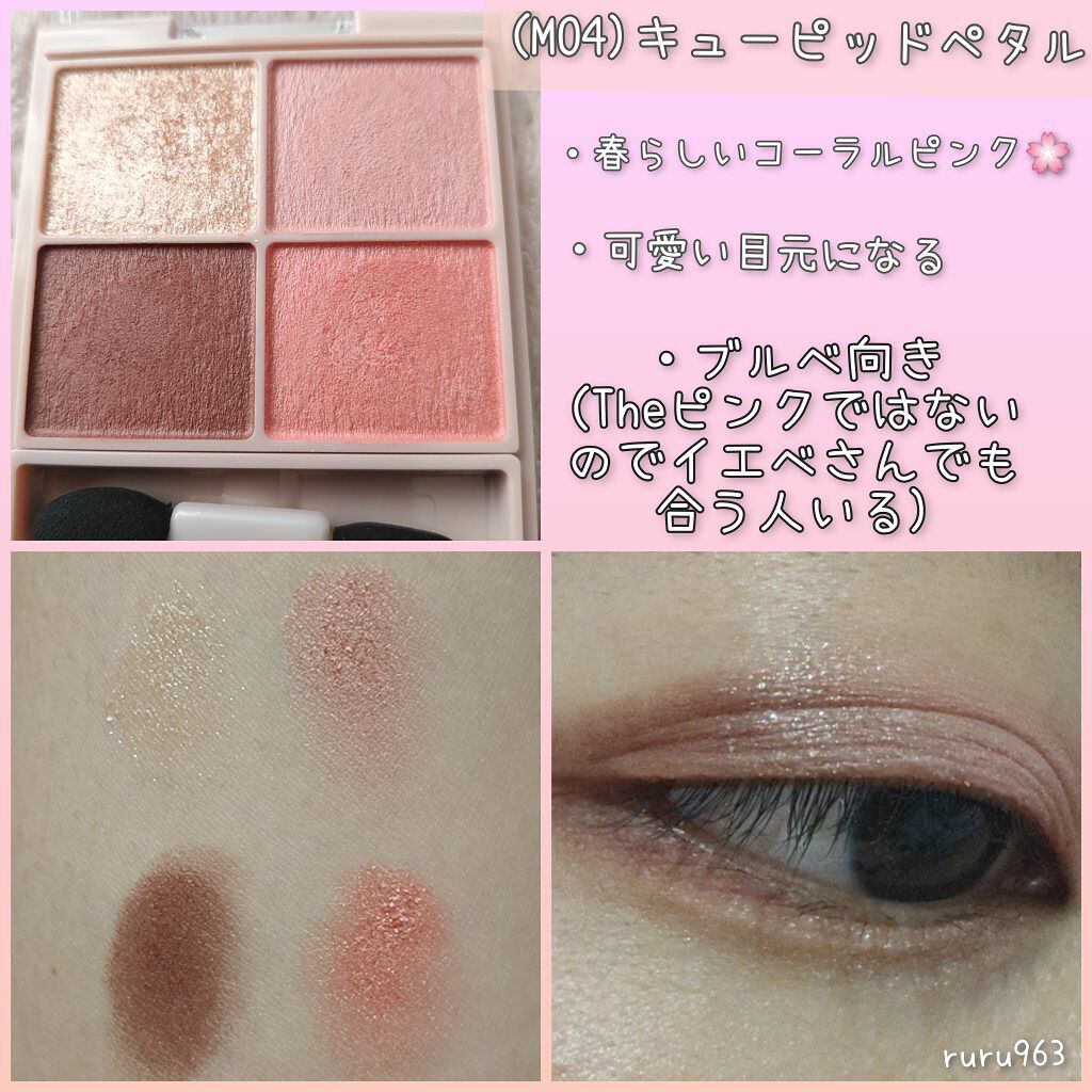 キャンメイク (M01)シエナウッド ・オレンジブラウン系アイシャドウ ・秋らしい色味で優しい目元になる ・普段使いやブラウン系好きな方におすすめ❤ ・イエベ向き (M02)チャイブリック ・ピンクテラコッタのアイシャドウ ・可愛い目元になる ・ピンク/赤みが強く、うさぎメイクやピンクメイクする方におすすめ❤ ・ブルベ向き (M03)ローズヒート ・ローズレッド系アイシャドウ ・可愛い目元になる ・ピンク/紫みが強く、うさぎメイクや闇メイクにおすすめ❤ ・ブルベ向き (M04)キューピッドペタル ・コーラルピンク系アイシャドウ ・春らしく、可愛い目元になる ・ブルベ向き