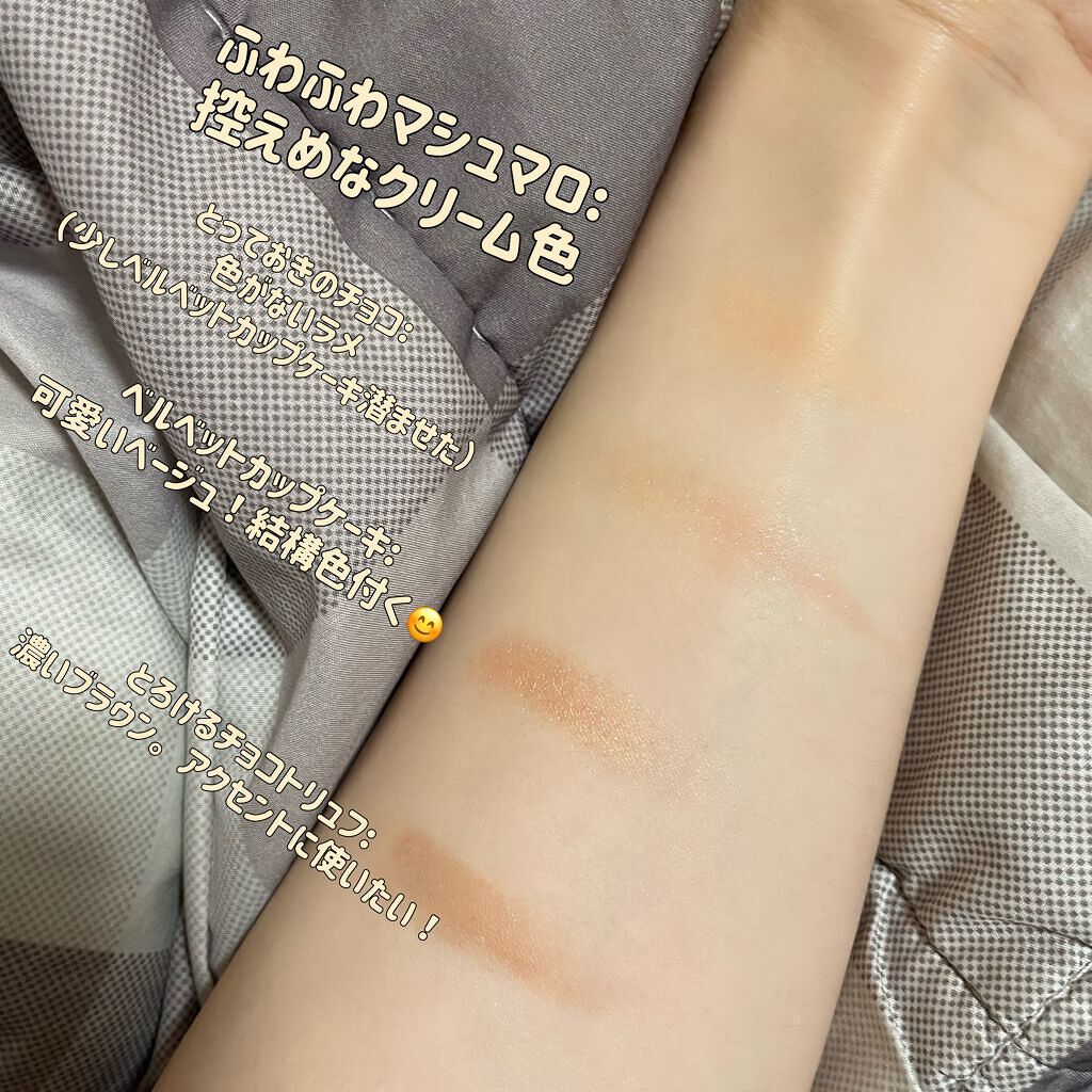 - 【数量限定商品】 まるで本物のチョコみたい!キュートなパッケージデザインに目が離せない。なめらかに彩るブラウンカラーをのせれば、心まで満たされるスイートな目元に。家族や友達、大切な人に贈りたい特別なアイシャドウパレット。 ひと塗りでムラなくまぶたに密着、しっとり濃厚に色づく高発色。 お好みのカラーを重ね使いすることで、より深みのある立体的なグラデーションが完成します。