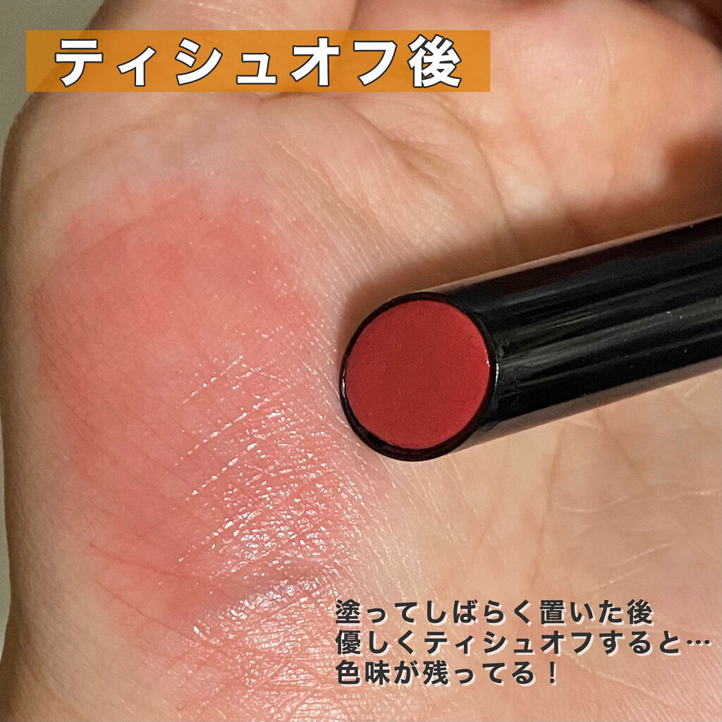 ・唇に血色を与えてくれる、優しいピンク ・1塗りで顔がパッと明るくなる ・水々しいさらさらテクスチャー ・うるっとツヤ感、ちゅるんとした唇になれる ・乾燥しにくい ・先に薬用リップなどで保湿し、その上に塗ればより保湿される ・チップが液をたっぷり含むので、ボトルの縁で少し液を落とすと丁度よくなります◎ ・1度塗りで唇を中央に乗せ、"んーま”と上下の唇を擦り合わせると、ナチュラルに発色します。 ・もし塗りぬれてない部分があった場合→塗り濡れてない部分だけに塗ると◎ ・ティッシュオフしても、ツヤ感は残り、色持ちが良かったです◎ ・ほのかに着く程度なので、塗ってすぐではなく、5分くらい乾燥させるとよりティッシュに付かなくなると思います😊 ・ティッシュオフ後はよりナチュラルな色味になりました。 ・2度ティッシュオフすると、2度目は付かなくなり、マスクにもつきませんでした◎ ・マスクしても色持ちがいいのでマスクメイクにも、なかなかお直しができない時にもおすすめです!