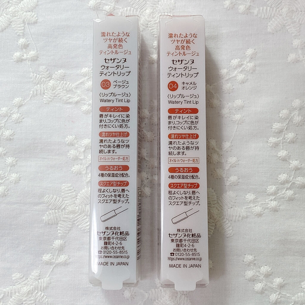 ♡CEZANNE人気リップ♡ 案の定キャメルオレンジだけでなく、ベージュブラウンも追加購入 それがプチプラの怖いところ 【使った商品】  CEZANNE ウォータリーティントリップ 【色味】  03 ベージュブラウン  04 キャメルオレンジ 【色もち】★★★★⭐︎ 【質感】ツヤ 【保湿】★★★★⭐︎ 【良いところ】  やっぱり色味がなんとも言えないいい色  発色もいいし、プチプラだし普段使いにどの  色も重宝してます ↓で06ピンクベージュと07ビターレッドも載せてます #CEZANNE #ウォータリーティントリップ