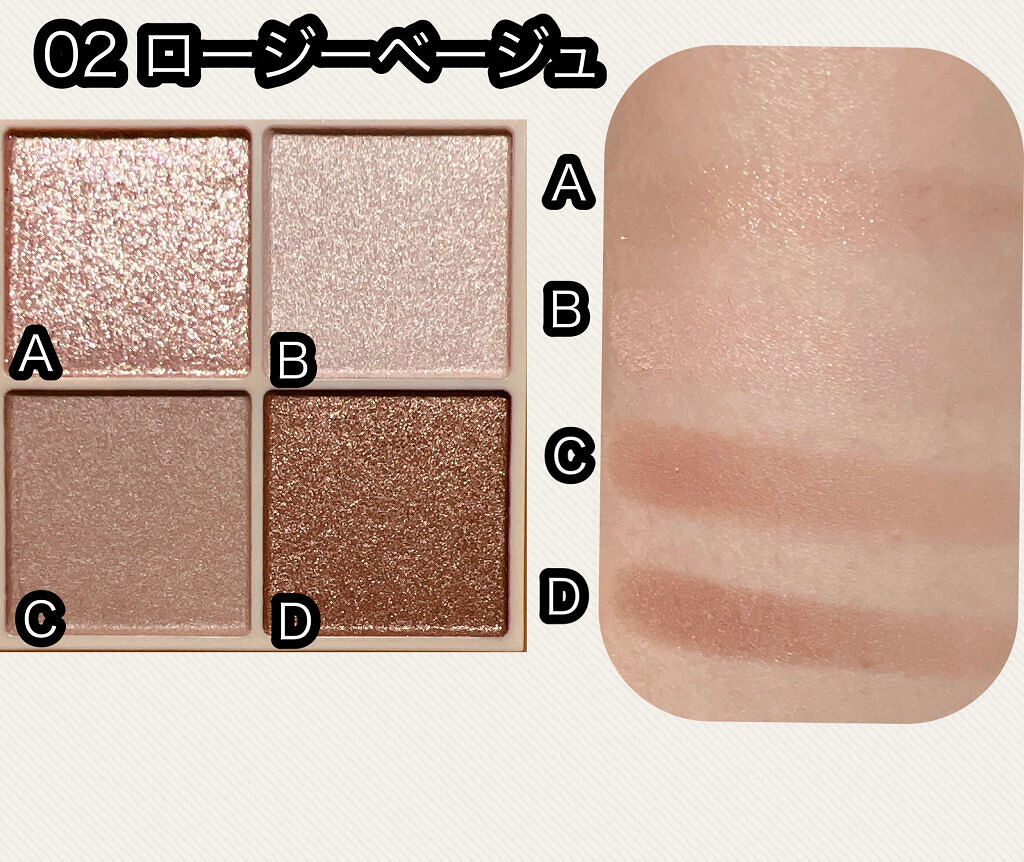 - ラメ・パール・マット3質感の4色アイシャドウ。 肌馴染みの良いベージュを基調としたカラー。ラメ・パール・マットの3質感を重ねて、自然にまぶたを強調し奥行のある大きな目元へ。 しっとり溶け込むような柔らかなパウダーなので、スルスル伸びてまぶたにピタッと密着。保湿成分(スクワラン・ホホバ種子油)配合。