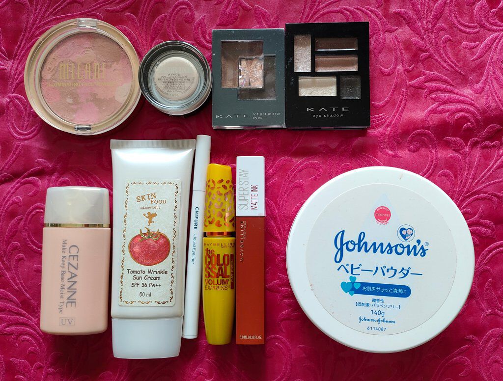 アリィー ニュアンスチェンジUV ジェル RSを、顔全体にまんべんなく塗ります。 RMK RMK ジェルクリーミィファンデーション 103を、顔全体にまんべんなく塗ります。 ジョンソンベビー ジョンソン ベビーパウダーを、顔全体にまんべんなく軽くはたきます。 THE BODY SHOP bronze shade warm glowを、両頬に塗ります。 KATE リフレクトミラーアイズ BR-1の締め色を、眉毛全体にまんべんなく塗ります。 URGLAM UR GLAMBLOOMING EYE COLOR PALETTE 01を、使用しました。 ちふれ リキッド アイライナー 筆ペンタイプ BK30 ブラックを、塗ります。 CEZANNE エアリーカールマスカラを、まつ毛全体にまんべんなく塗ります。 MAYBELLINE NEW YORK コロッサルボリュームエクスプレスを、まつ毛全体にまんべんなく塗ります。 MAYBELLINE NEW YORK SPステイ マットインク 135を、唇全体にまんべんなく塗ります。