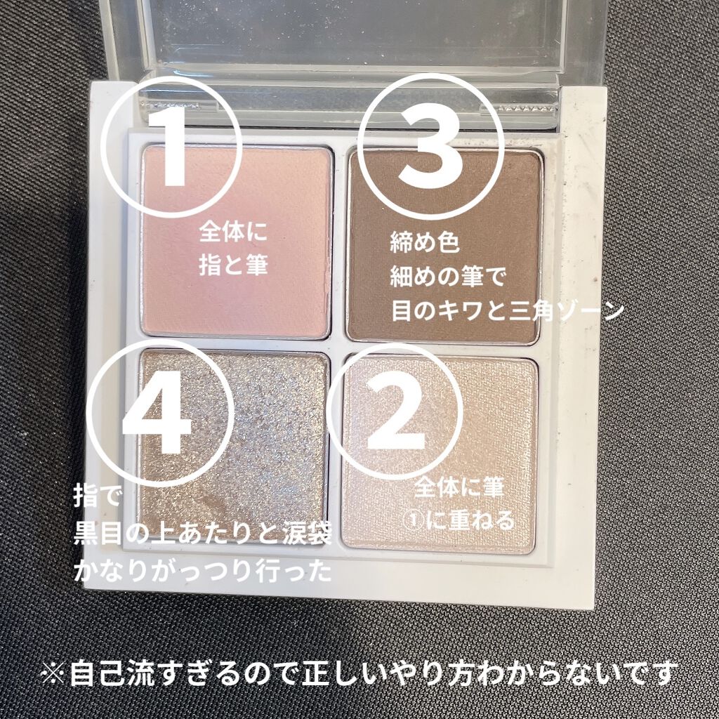 使い方を裏面に書いてあるものから大幅に間違えました。が、結果なんか良い感じになりました。 右上のオレンジを全面に使うことで重くなりすぎず夏っぽくなる気がします🍊 それぞれのラメのきらめきが上品で高級感があります👏 個性的な色の集合に見えて、重ねてみると良い感じに混ざってキレイな色味を作れるのが良いですね🫧🙌