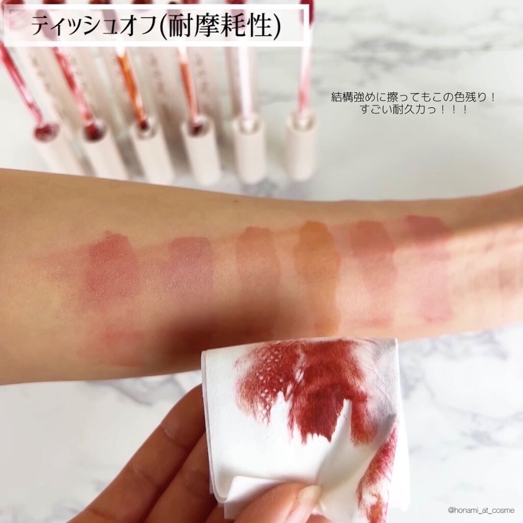 - ツヤ膜でLIPカラーを閉じ込める 塗ってから「5分」でかわいい唇完成♥ツヤがあふれ出るオイルinウォーターティント 水に対して約2倍のオイル成分を配合した「オイルinウォーター処方」 時間経過でツヤ膜がじゅわ~っとあふれ出し、 まるでグロスを重ねたような仕上がりに。みずみずしいツヤ感が持続します。 塗布後、時間経過(※)で色が定着して食べても飲んでも血色長持ち。 (※定着には個人差があります。弊社5分推奨) 高密着で唇に溶け込むように色づきます。 コップやペットボトルへの色移りがしにくくなります。