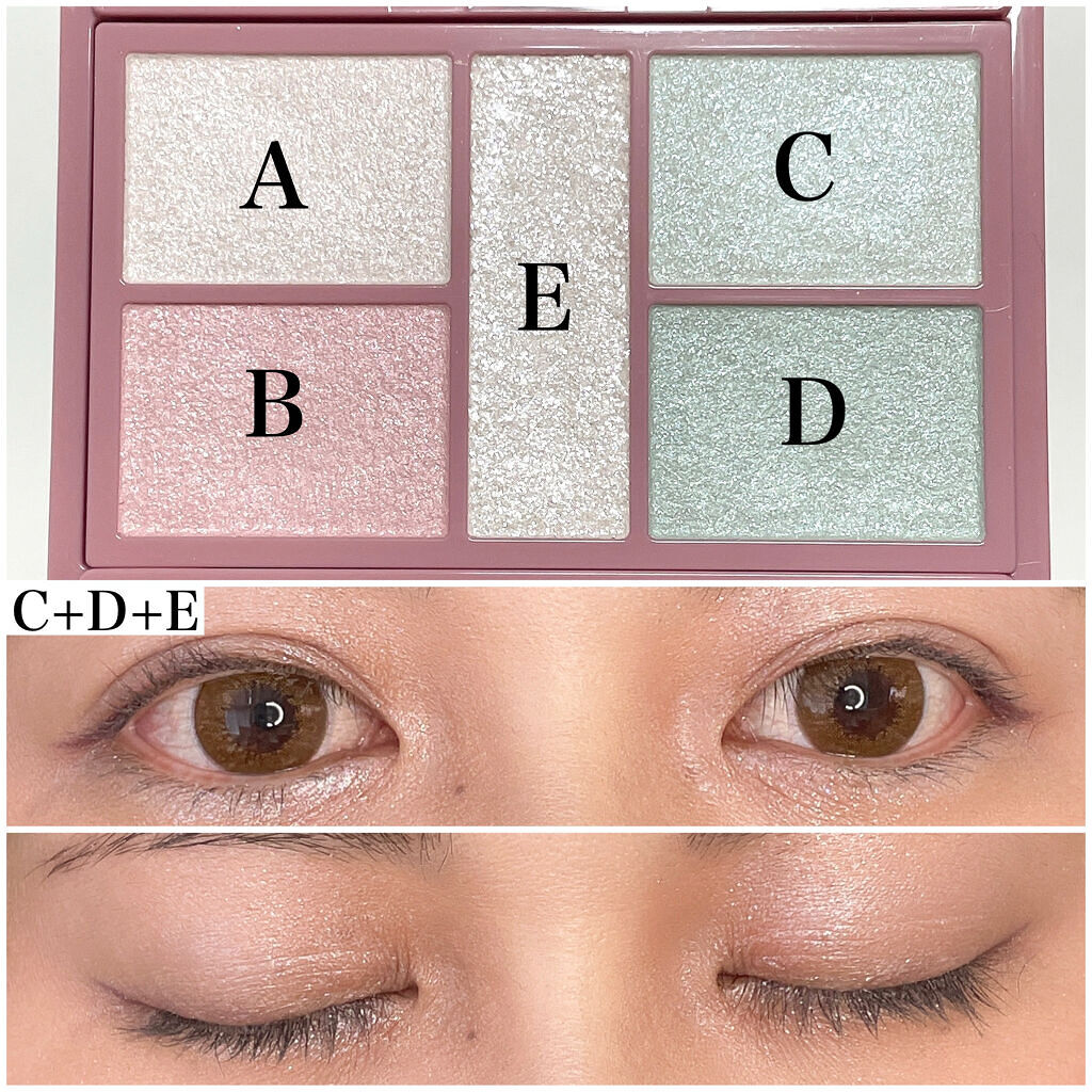 - 1枚のパレットで2つのスタイルが完成! 5色の欲ばりアイシャドウ♥ メインカラーを選んで2つのスタイルが楽しめる! A→B→D でスタイル1 A→C→D でスタイル2 繊細な粉質が、しっとりとまぶたに密着して色落ちを防ぎます。 透明感のあるキラうるトッピングジュエル(繊細ラメ)は、気分によってトッピング!