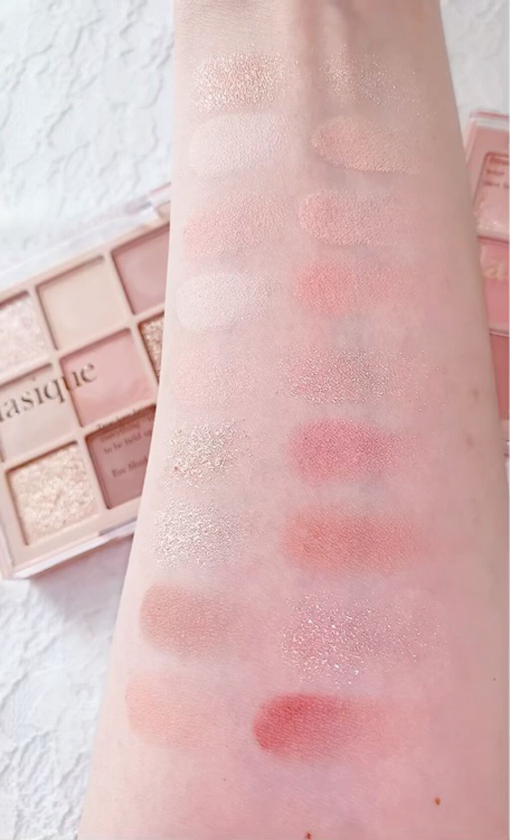 粉質は少ししっとりしているけど、柔らかすぎず、ラメは密着感がいいです👍 発色も見たまま発色してくれるし、優しい目元が簡単に作れます😋✨ ホントめちゃめちゃ可愛くてお気に入りのパレット達です🙌🙌🙌🙌🙌💕オススメです😮💨❤️