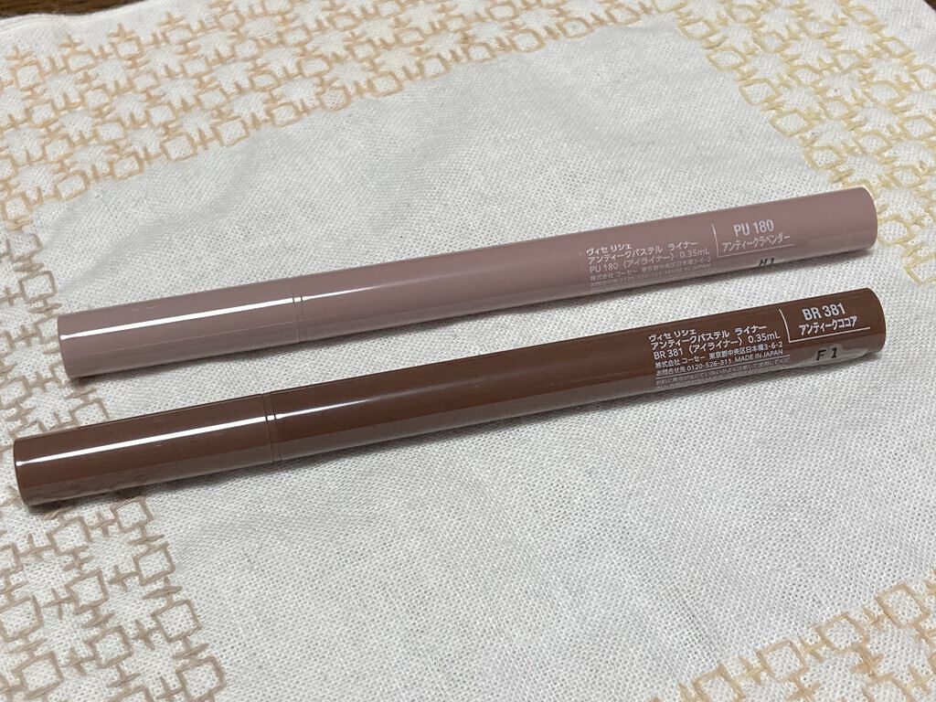 Viséeリシェ アンティークパステル ライナーPU18 アンティークラベンダー Viséeリシェ アンティークパステル ライナーBR381 アンティークココア 使いやすい配色とアンティーク調なので落ち着き感があります。 なので、パールが入ってても浮くことはないです。 大人っぽくて好き、渋めが、アクセントになって良しと言うのが感想です。