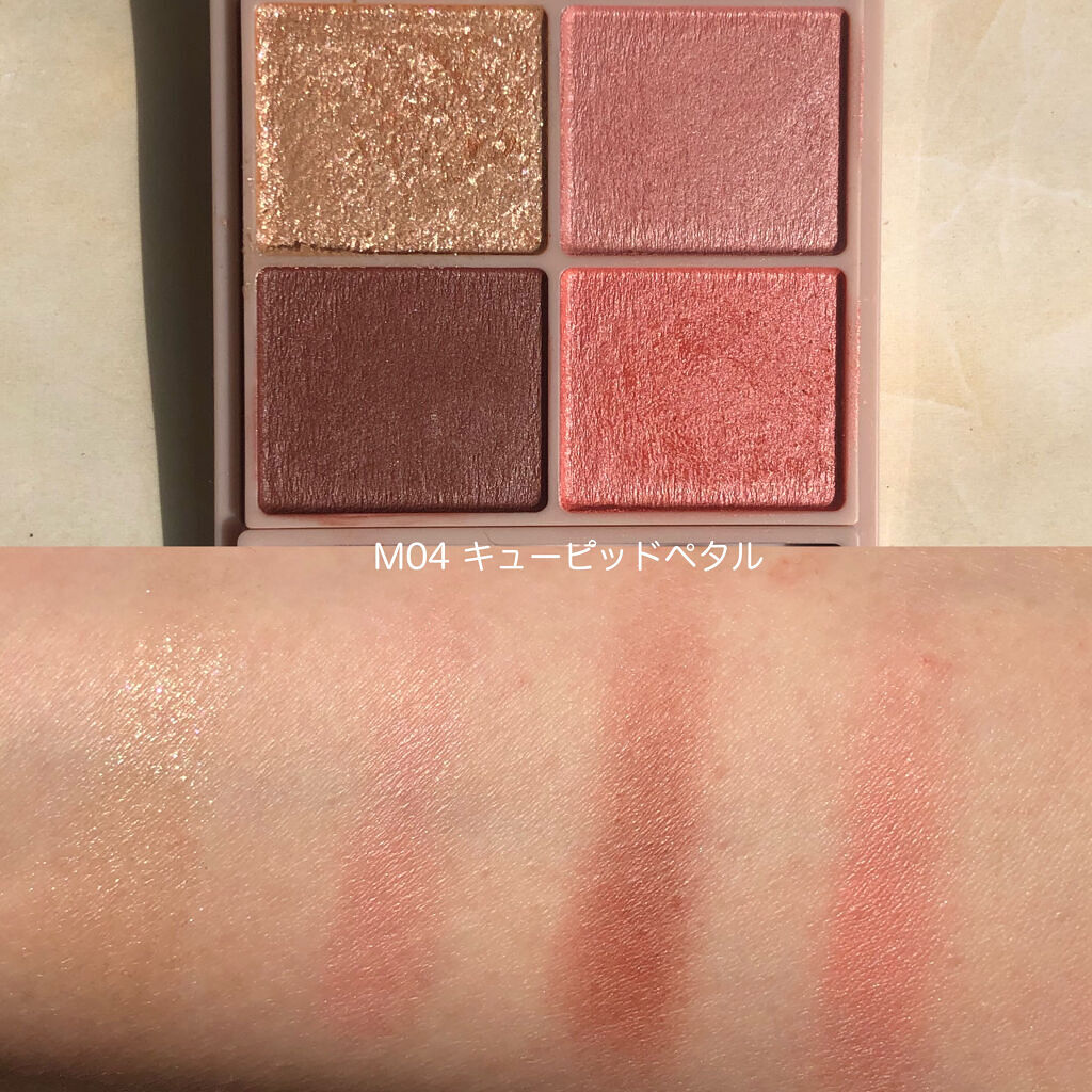 - シルキースフレアイズの姉妹品♡ 肌に溶け込むような透けマットシャドウ 透け感のある柔らかい仕上がりになるマット3色と、透け発色の繊細ラメ1色のパレットシャドウ♡ 完全マットアイや、ラメ×マットアイなど、メイクのパターンを楽しみましょう!