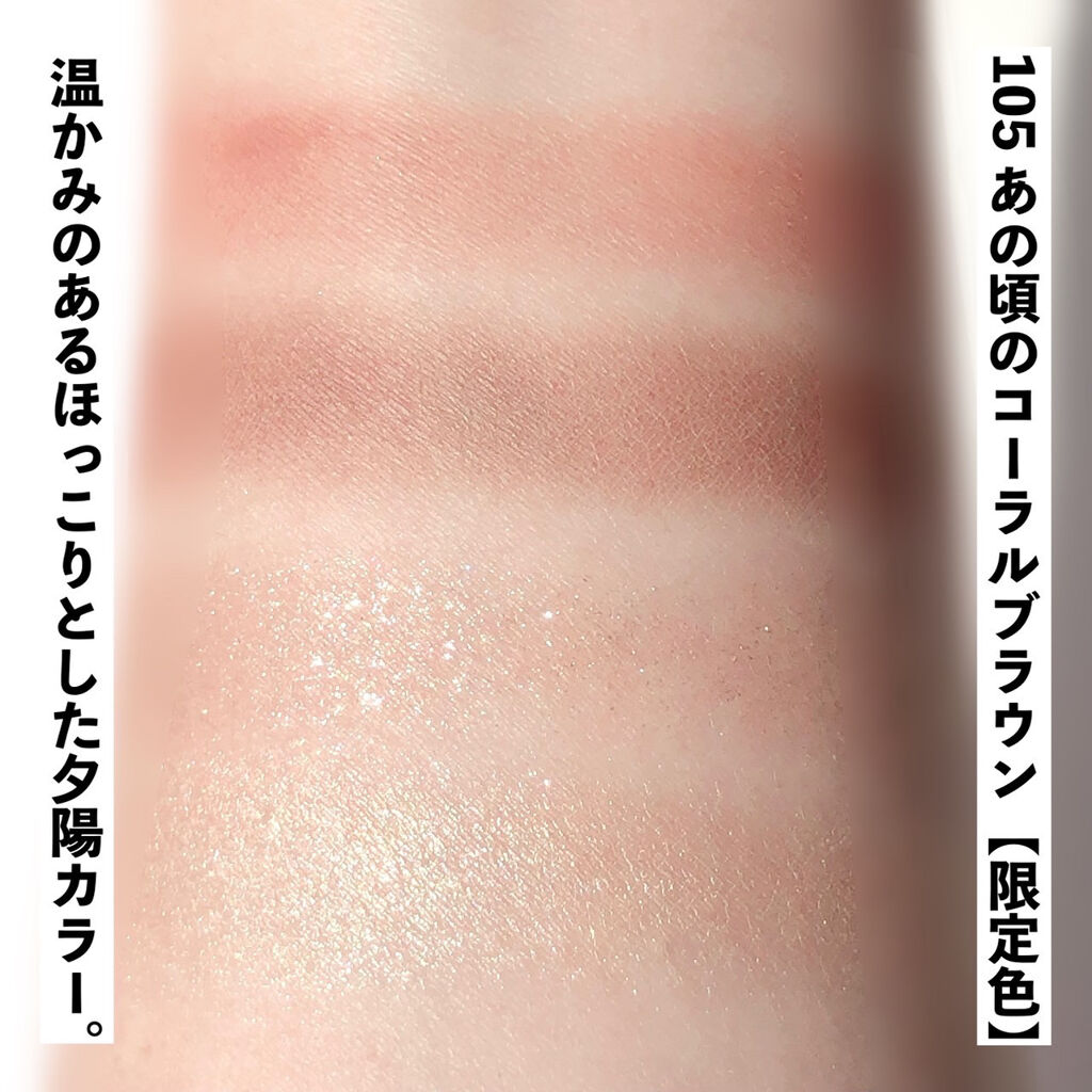 - <08 本気のブラウン> タルク、マイカ、酸化チタン、ホウケイ酸(Ca/チタン)、ホウケイ酸(Ca/Al)、酸化鉄、ポリメタクリル酸メチル、ヘキサ(ヒドロキシステアリン酸/ステアリン酸/ロジン酸)ジペンタエリスリチル、ミリスチン酸Mg、(ジメチコン/ビニルジメチコン)クロスポリマー、ナイロン-12、(フッ化/水酸化/酸化)/(Mg/K/ケイ素)、ラウリン酸ヘキシル、リンゴ酸ジイソステアリル、ステアロイルオキシステアリン酸オクチルドデシル、トリ(カプリル酸/カプリン酸)グリセリル、フェニルトリメチコン、シリカ、窒化ホウ素、ポリプロピレン、ホウケイ酸(Ca/Na)、ラウロイルリシン、ビスジグリセリルポリアシルアジペート-2、ステアリン酸Mg、カプリリルグリコール、ネオペンタン酸イソステアリル、ジメチコン、合成フルオロフロゴパイト、カプリル酸グリセリル、ミリスチン酸イソセチル、グンジョウ、銀、エチルヘキシルグリセリン、水酸化Al、トリエトキシカプリリルシラン、水添レシチン、酸化スズ、ハイドロゲンジメチコン、赤226、水、塩化Na、トコフェロール、硫酸Na <09 再会のピンク> タルク、マイカ、酸化チタン、ホウケイ酸(Ca/チタン)、ラウリン酸ヘキシル、リンゴ酸ジイソステアリル、フェニルトリメチコン、ミリスチン酸Mg、ナイロン-12、酸化鉄、ホウケイ酸(Ca/Al)、ステアロイルオキシステアリン酸オクチルドデシル、ヘキサ(ヒドロキシステアリン酸/ステアリン酸/ロジン酸)ジペンタエリスリチル、ポリメタクリル酸メチル、ビスジグリセリルポリアシルアジペート-2、ポリプロピレン、合成フルオロフロゴパイト、シリカ、ステアリン酸Mg、トリ(カプリル酸/カプリン酸)グリセリル、ポリメチルシルセスキオキサン、ネオペンタン酸イソステアリル、ジメチコン、カプリリルグリコール、トリエトキシカプリリルシラン、カプリル酸グリセリル、(ジメチコン/ビニルジメチコン)クロスポリマー、エチルヘキシルグリセリン、グンジョウ、赤226、水酸化Al、酸化スズ、カルミン、水、塩化Na、硫酸Na、トコフェロール <103 ハッピーエディション【新】> タルク、マイカ、ホウケイ酸(Ca/チタン)、酸化チタン、合成フルオロフロゴパイト、ジメチコン、トリ(カプリル酸/カプリン酸)グリセリル、ポリプロピレン、ポリメタクリル酸メチル、ジフェニルシロキシフェニルトリメチコン、酸化鉄、ヘキサ(ヒドロキシステアリン酸/ステアリン酸/ロジン酸)ジペンタエリスリチル、ビスジグリセリルポリアシルアジペート-2、リンゴ酸ジイソステアリル、ミリスチン酸Mg、(ジメチコン/ビニルジメチコン)クロスポリマー、ダイマージリノール酸(フィトステリル/イソステアリル/セチル/ステアリル/ベヘニル)、フェニルトリメチコン、ダイマージリノール酸ダイマージリノレイルビス(ベヘニル/イソステアリル/フィトステリル)、ジヘプタン酸ネオペンチルグリコール、ホウケイ酸(Ca/Al)、ジエチルヘキサン酸ネオペンチルグリコール、ラウリン酸ヘキシル、ポリイソブテン、ポリメチルシルセスキオキサン、カプリリルグリコール、ポリエチレン、ラウロイルリシン、カプリル酸グリセリル、ステアロイルオキシステアリン酸オクチルドデシル、エチルヘキシルグリセリン、ミリスチン酸イソセチル、酸化スズ、グンジョウ、スオウ樹皮エキス、トリエトキシカプリリルシラン、水添レシチン、カルミン、水酸化Al、赤226、水、トコフェロール、塩化Na、硫酸Na、コチニール等(カルミン) <104 ときめきのポッピンラメ【新】> ホウケイ酸(Ca/Al)、マイカ、タルク、ジヘプタン酸ネオペンチルグリコール、ポリイソブテン、リンゴ酸ジイソ ステアリル、ホウケイ酸(Ca/チタン)、酸化チタン、ポリプロピレン、シリカ、ヘキサ(ヒドロキシステアリン酸/ ステアリン酸/ロジン酸)ジペンタエリスリチル、(ジメチコン/ビニルジメチコン)クロスポリマー、ポリエチレン、酸化鉄、ホウケイ酸(Ca/Na)、合成フルオロフロゴパイト、ポリメタクリル酸メチル、トリ(カプリル酸/カプリ ン酸)グリセリル、ミリスチン酸Mg、ダイマージリノール酸(フィトステリル/イソステアリル/セチル/ステアリ ル/ベヘニル)、ビスジグリセリルポリアシルアジペート-2、カプリリルグリコール、カプリル酸グリセリル、銀、酸化スズ、エチルヘキシルグリセリン、赤226、硫酸Ba、トリエトキシカプリリルシラン、トコフェロール