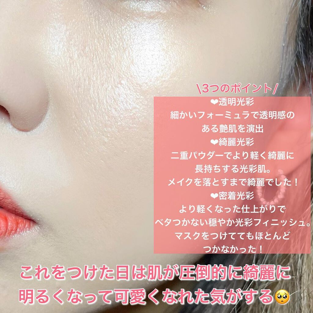 ほのかにベージュがかっているので浮いてる感がなく、肌馴染みがとてもいいです! 細かいパールで内から滲み出るような艶感がだせます♡ スティックタイプで一塗りで濡れ感が出せるのが本当に感動! 艶感が出せるハイライトは沢山売られていますがこれはとにかく別格です!!! 本当に濡れているようなお肌になるのと上品な艶なので一気に透明感でます🧡 まぶたにつけてあげるのもおすすめ! 6時間以上の保湿力もあり、時間が経つにつれ肌により馴染んでいく感じがします🥰 全然なくならないので、少しお高めですが買う価値ありですよ♪
