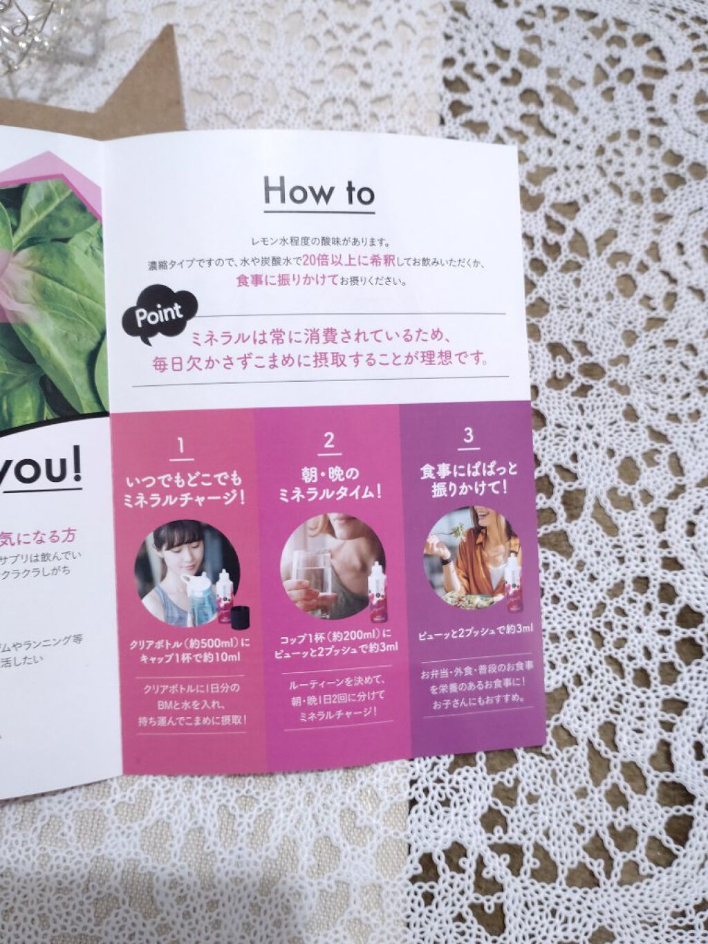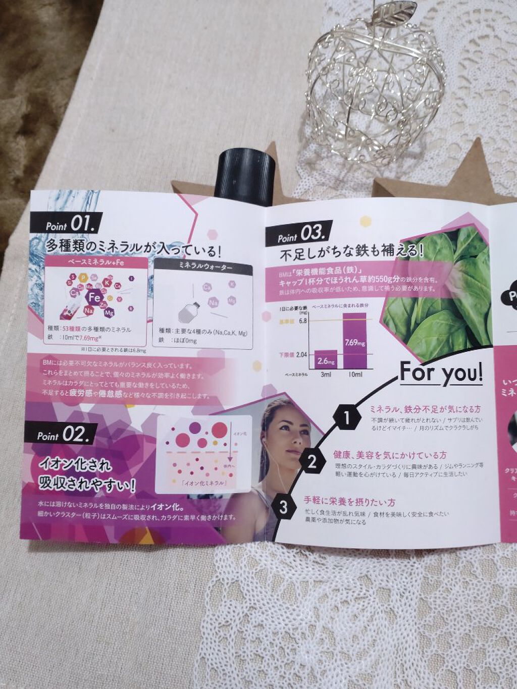 36種類以上の「ミネラル」と女性が不足しがちな「鉄」に特化したサプリメント【 ベースミネラル+Fe 】100ml / 3,240 円(税込) キャップ一杯分摂取すればほうれん草550g分の鉄分が摂れるんだって 手軽に鉄分やミネラルが摂取できるところがいいですね女性に不足しがちな「鉄」