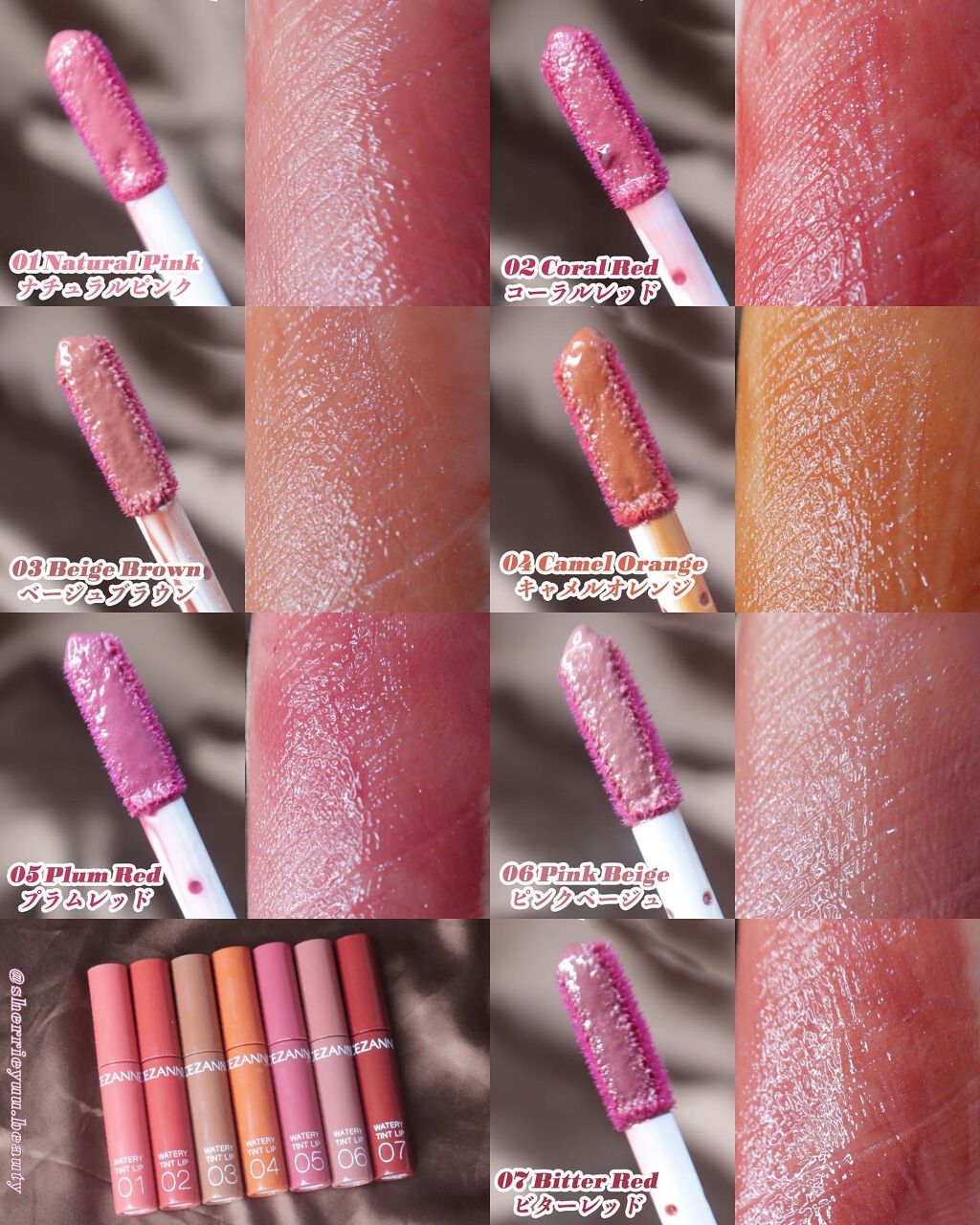 CEZANNEのウォータリーティントリップから新色が出た〜(*˘︶˘*).。.:*♡ということで全色スウォッチいってみたいと思います🙌🏻💕濡れたようなツヤが長時間持続するティントルージュ。水に濡れたような軽やかなツヤが持続✨唇に色がフィットし...