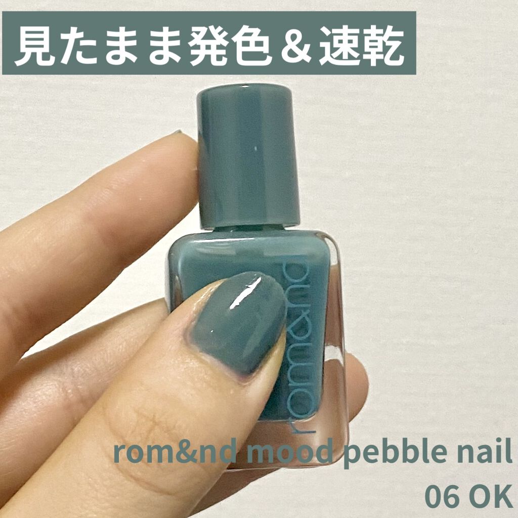 - 指先に玉石のような、ならかな光沢をとどめる。塗った瞬間から綺麗なツヤと光沢を維持し、重ねて塗っても透き通ったカラー感を鮮やかにとどめる、素早い乾燥力のナチュラルカラーネイル。「ロムアンド」の次世代型ネイルです。