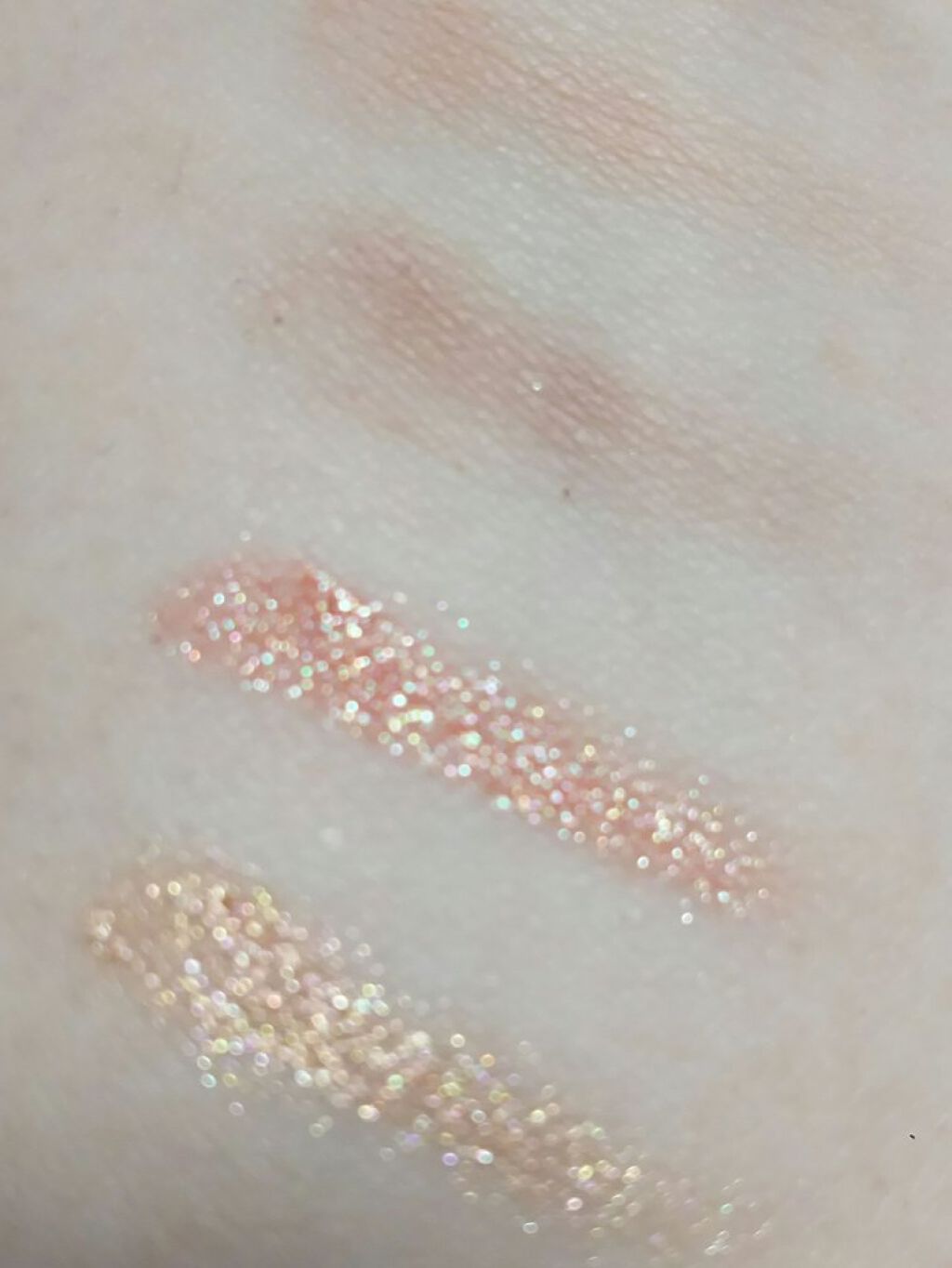 色々なカラーバリエーションがありますが、スタンダードなパレットです。 使いやすい色のセットで、そこまでえげつなく発色するわけではなく、かといって発色しないわけでもないパレットです。 マットの粉はみっしりと詰まっていて、わりとしっかりとした筆じゃないと案外粉が取れないかもしれません。 チップ等が付属していないのはちゃんとした筆を用意してほしいということなのかも……? それはこのキラキラの多色ラメ、粉が緻密で軽すぎて、飛ぶこと…… アイベースを使っていても飛ぶので、結構致命的です。 それでも色はいいし粉もこの値段なら悪くないのでプチプラの中ではおすすめ出来る方です。
