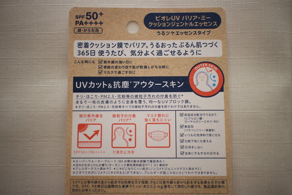 - 花粉・チリ・ほこり・PM2.5等の微粒子付着までバリア※1。密着クッション膜でうるおった”ぷるん肌”※2続く ・SPF50+ PA++++ ・うるツヤエッセンスタイプで全身するする伸ばせて、毎日使いたくなる気持ちいい使用感 ・マスク擦れに強く、落ちにくい ・保湿成分配合(ヒアルロン酸・ローヤルゼリーエキス・BG) ・化粧下地にも使える(皮脂崩れ防ぐ) ・白浮きしない ・いつもの洗浄料で落とせる ※1 すべての微粒子汚れの付着を防ぐわけではありません ※2 保湿効果による