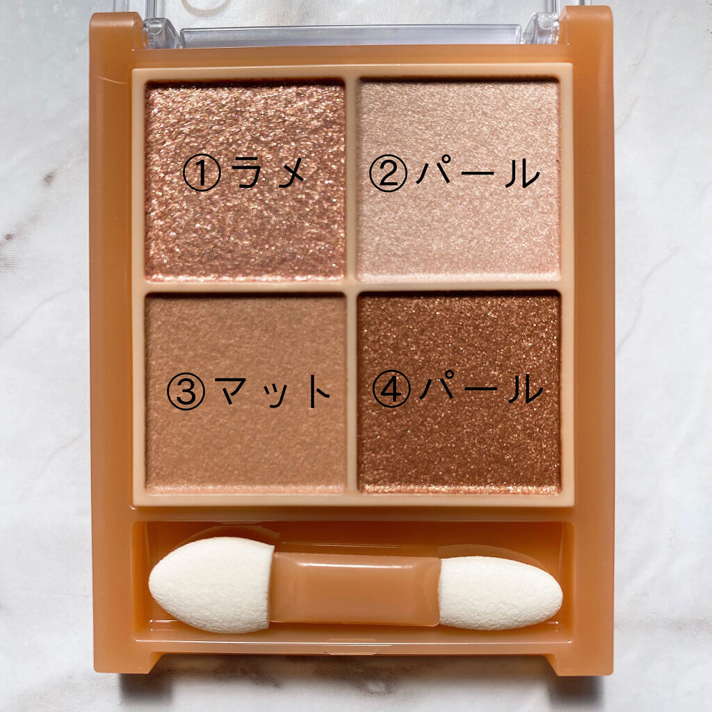 - ラメ・パール・マット3質感の4色アイシャドウ。 肌馴染みの良いベージュを基調としたカラー。ラメ・パール・マットの3質感を重ねて、自然にまぶたを強調し奥行のある大きな目元へ。 しっとり溶け込むような柔らかなパウダーなので、スルスル伸びてまぶたにピタッと密着。保湿成分(スクワラン・ホホバ種子油)配合。