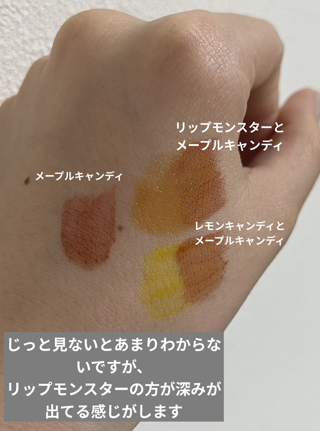 水ティントなので、口紅の重さがないのがいい。 塗って乾いた後はすっぴん唇みたいな感覚! イエローが万能! 単色使いは難しいけど、下地としては本当に万能。 無香料 乾くと乾燥が気になる。 唇が荒れてると色むらが出る。 リップモンスターオレンジ寄り キャンディステイン蛍光イエロー キャンディステインの方が水テクスチャーなので口紅の邪魔をしないです。 リップモンスターの方がオレンジ寄りなので、深みが出る。そこまではっきりは違いはなさそう😶