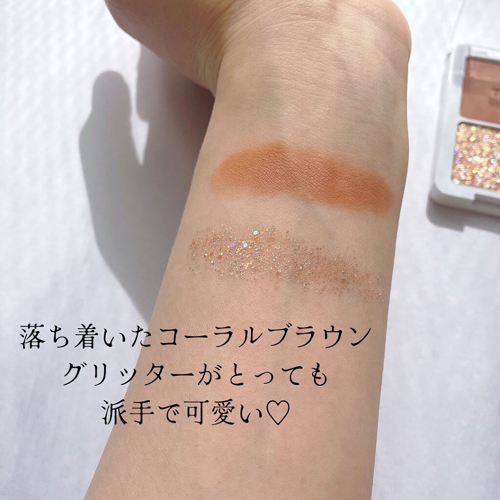 - マットな質感のシャドウとラメが入っているシャドウ、2種類のシャドウで構成されているアイシャドウパレット。 マットな質感のシャドウはチークやシェティングとして使うのがおすすめ目元はもちろんフェイスや体どこにでも使用可能。