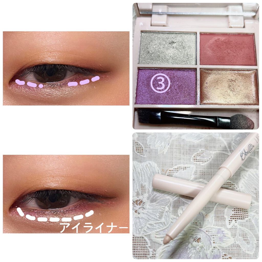 ラメをメインにしたくてあえて目尻にだけパープル💜 ポイントで使うとケバくならないし程よく透明感が出るからおすすめ◎ ③のラメがさらさらなのにラメ飛びしなくて抜群に使いやすい◎ マスカラはバーガンディ👀 ラインはブラウンでナチュラルに仕込んでみた! チークもパープルにしたけどほんのり薄くのせる程度! 底見え拡大してきた!!嬉しい😆 リップはフィグフィグ💋