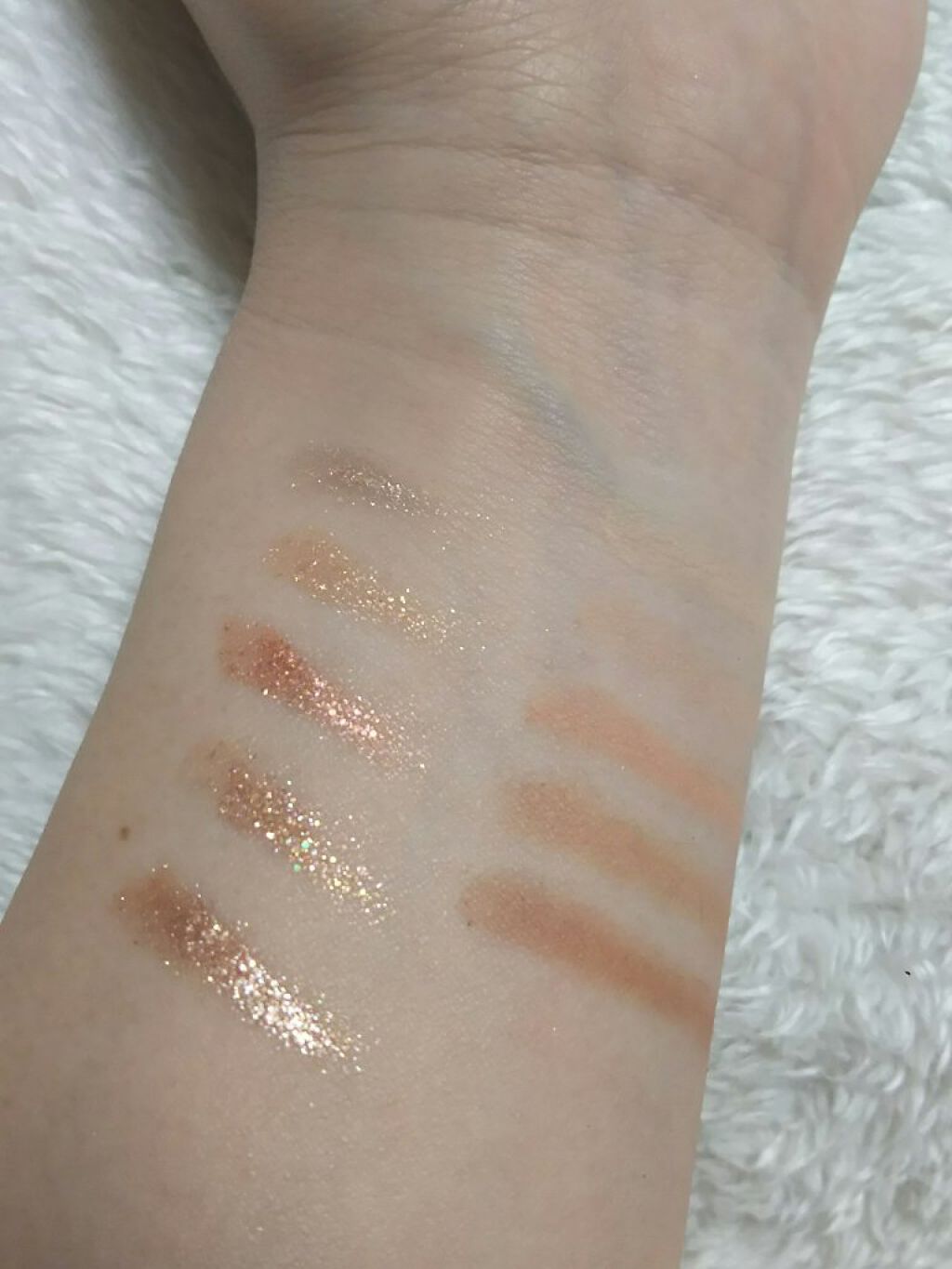 色々なカラーバリエーションがありますが、スタンダードなパレットです。 使いやすい色のセットで、そこまでえげつなく発色するわけではなく、かといって発色しないわけでもないパレットです。 マットの粉はみっしりと詰まっていて、わりとしっかりとした筆じゃないと案外粉が取れないかもしれません。 チップ等が付属していないのはちゃんとした筆を用意してほしいということなのかも……? それはこのキラキラの多色ラメ、粉が緻密で軽すぎて、飛ぶこと…… アイベースを使っていても飛ぶので、結構致命的です。 それでも色はいいし粉もこの値段なら悪くないのでプチプラの中ではおすすめ出来る方です。