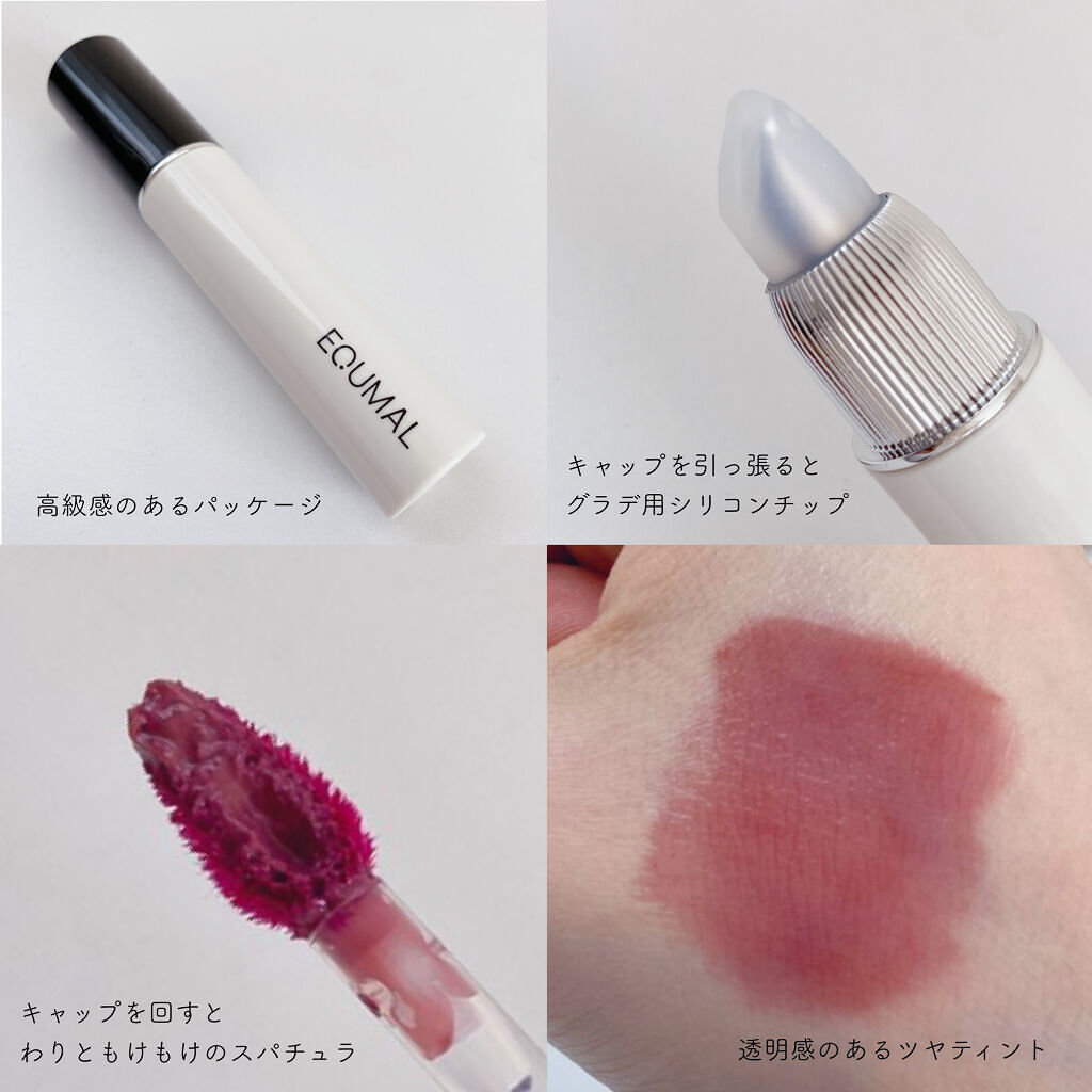 - 韓国のビューティー系インフルエンサー、LAMUQUE(ラミュク)さんが手掛けるブランド「EQUMAL(エクマル)」のティントリップ。 オイル膜が水分ティントを包み込み、みずみずしくツヤのある仕上がりをキープします。 時間が経過するほど透明感が増し、ツヤっとした質感が引き立ちます! ✓40%の水分量とローズリップオイルを配合 ✓ グラッシーグロウフィニッシュ:美しい発色&立体的&透明感溢れる仕上がり ✓ 革新的な使い心地:唯一無二の『シグネチャーリップスプレッダー』 →カラーを均一に密着させた後にグレーザーで唇の外側をぼかすと簡単にグラデーションリップ出来上がり! ✓ ベタつかずに時間が経つとともに浮かんでくるオイルの艶感!潤いとツヤを一日中キープ!