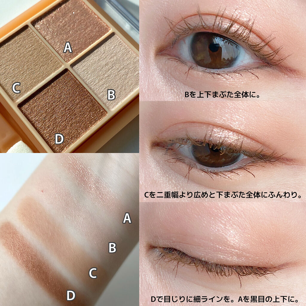 - ラメ・パール・マット3質感の4色アイシャドウ。 肌馴染みの良いベージュを基調としたカラー。ラメ・パール・マットの3質感を重ねて、自然にまぶたを強調し奥行のある大きな目元へ。 しっとり溶け込むような柔らかなパウダーなので、スルスル伸びてまぶたにピタッと密着。保湿成分(スクワラン・ホホバ種子油)配合。