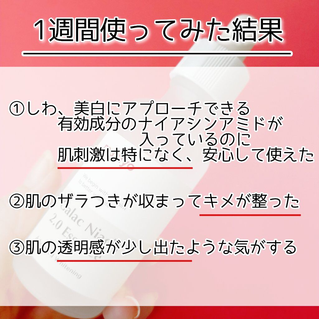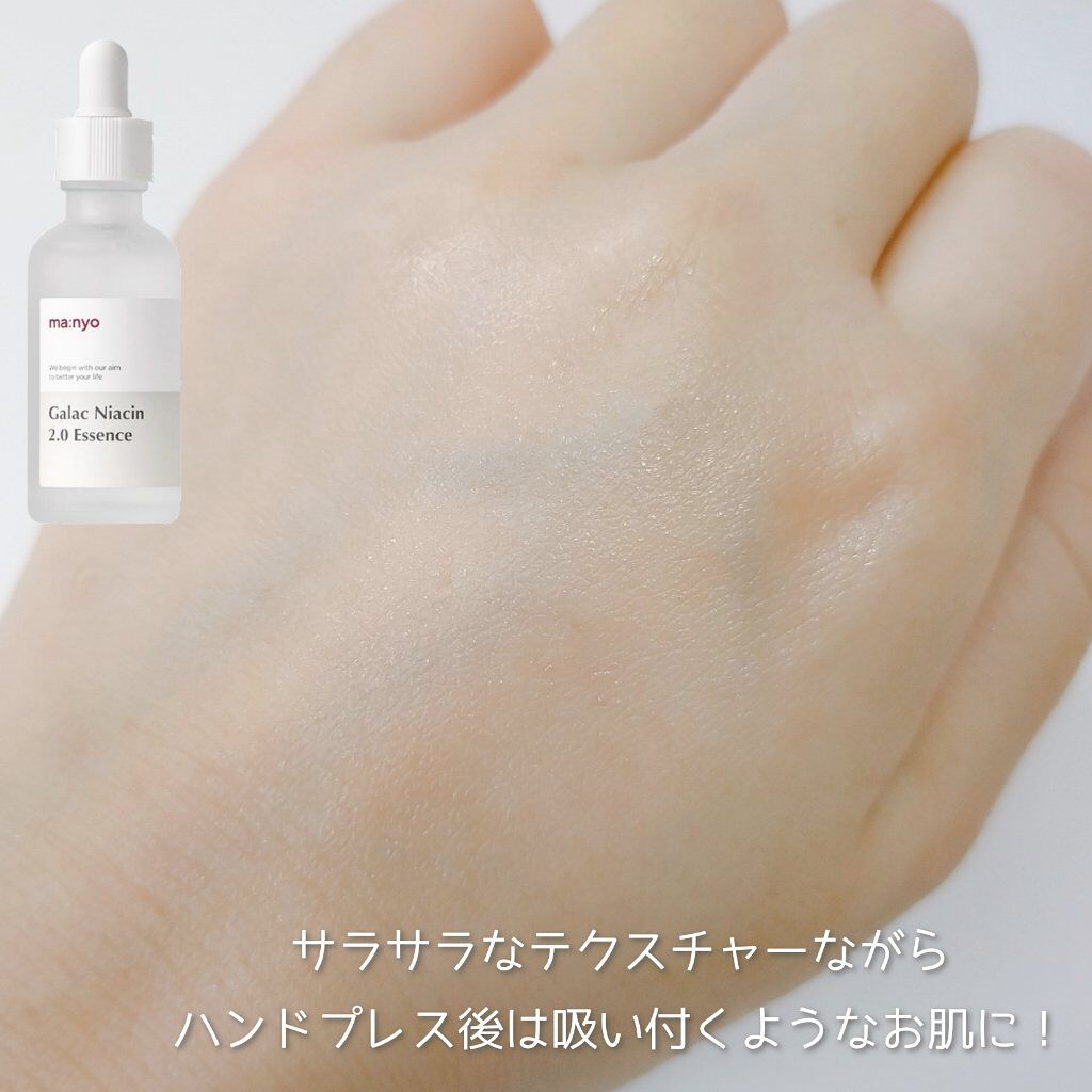 - ビタミン、アミノ酸などの有効成分を豊富に含んだガラクトミセスが93%配合され、皮脂・水分バランスの調節、毛穴ケア、トーンアップケアをサポート。ナイアシンアミド4%配合でメラニンの生成を防ぐ濃縮美容液です。水のような軽いテクスチャーでべたつきません。愛用者からは「2週間で肌の変化を実感した」との声が多く届いています。