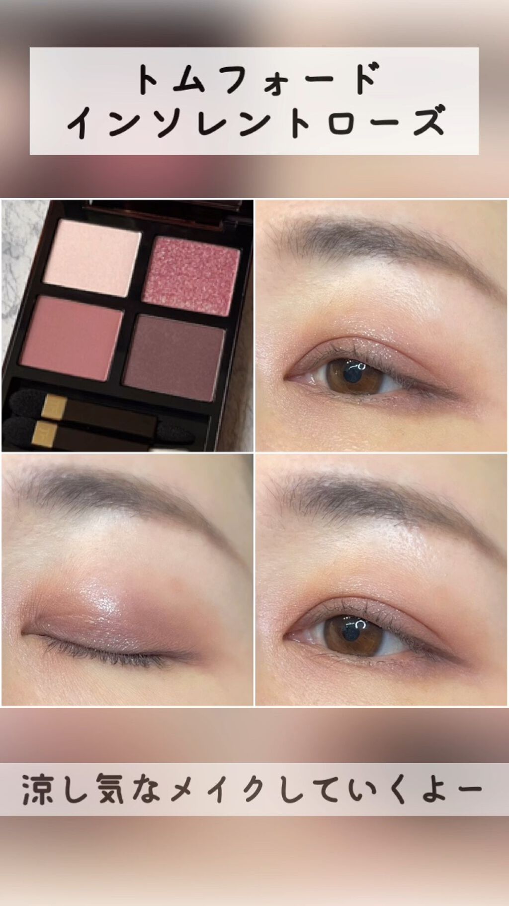 #いつかのメイクトムフォードインソレントローズインソレントローズは可愛らしい色合いなのに、右下のパープルが大人なくすみパープルだから甘くなりすぎないのが好き。チーク、ハイライトOSAJIことづてエレガンススリークフェイスNPK107リップエレ...