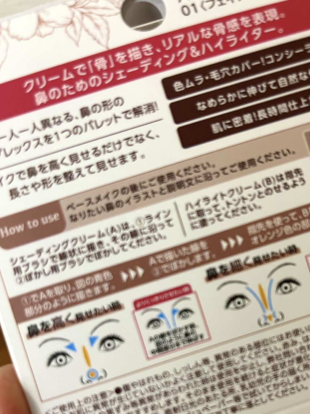 - クリームタイプの鼻筋補正パレット。 影色(シェーディング)で鼻の付け根から鼻の中央にハイライトをひとすじのせると、あら不思議! 鼻筋がスッと通った美人顔に。のっぺり見えがちな目周りに立体感がでて、「はっ」とするほど印象的なメリハリフェイスに。 一人ひとり異なる鼻のお悩みやコンプレックスをこれ1つでカバー! 鼻の高さ、幅、形などを光と影の錯覚を使い鼻の印象を整えて美しく見せます。 ・骨を描いて鼻筋補正 影色ブラウンとハイライト効果で鼻筋を補正します。悩みにあわせて鼻を高くしたり、小鼻を小さく見せたり、鼻筋をまっすぐに整えたり…と自由に鼻の印象を演出します。 ・つけたての仕上がりが長時間持続 フィットオイル配合。しっかり肌に密着しメイクしたての仕上がりが長時間続きます。高発色で擦れにも強いクリームタイプ。メイク直しができない時も発色をキープします。 ・なめらかに伸びてぼかしやすい ライトタッチオイル配合で、伸びがよく、きれいにぼかせます。ヨレ知らずでスッと通った鼻筋が簡単に描けます。クリームだから粉飛びの心配も不要。狙ったところにピンポイントに入れられます。 ・ベタつかずサラサラな仕上がり。 皮脂が出やすい鼻周りのために、テカリ防止成分を配合。ベタつかず、サラサラな仕上がり。ウォータープルーフで汗にも強い処方です。