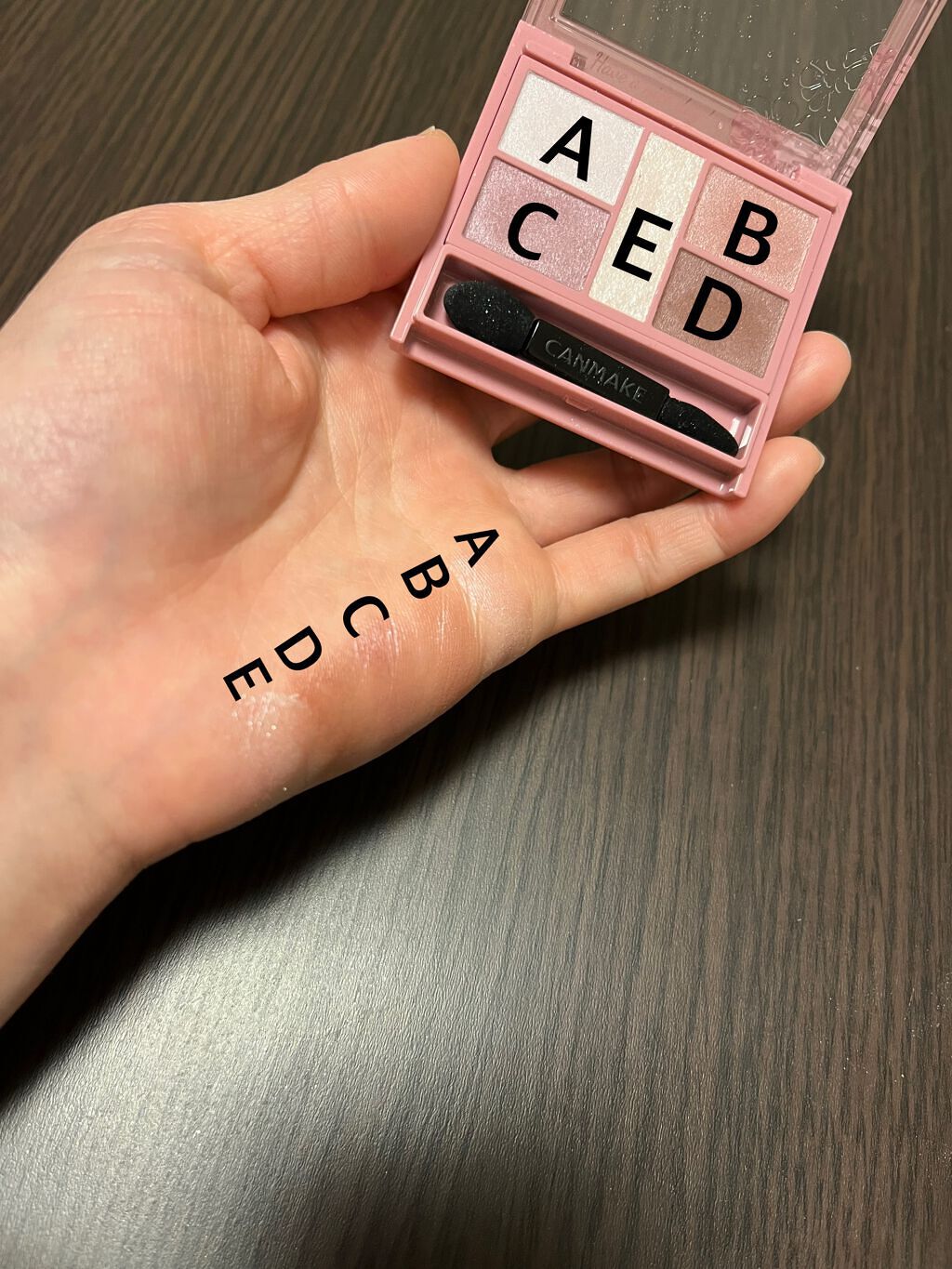 - 1枚のパレットで2つのスタイルが完成! 5色の欲ばりアイシャドウ♥ メインカラーを選んで2つのスタイルが楽しめる! A→B→D でスタイル1 A→C→D でスタイル2 繊細な粉質が、しっとりとまぶたに密着して色落ちを防ぎます。 透明感のあるキラうるトッピングジュエル(繊細ラメ)は、気分によってトッピング!
