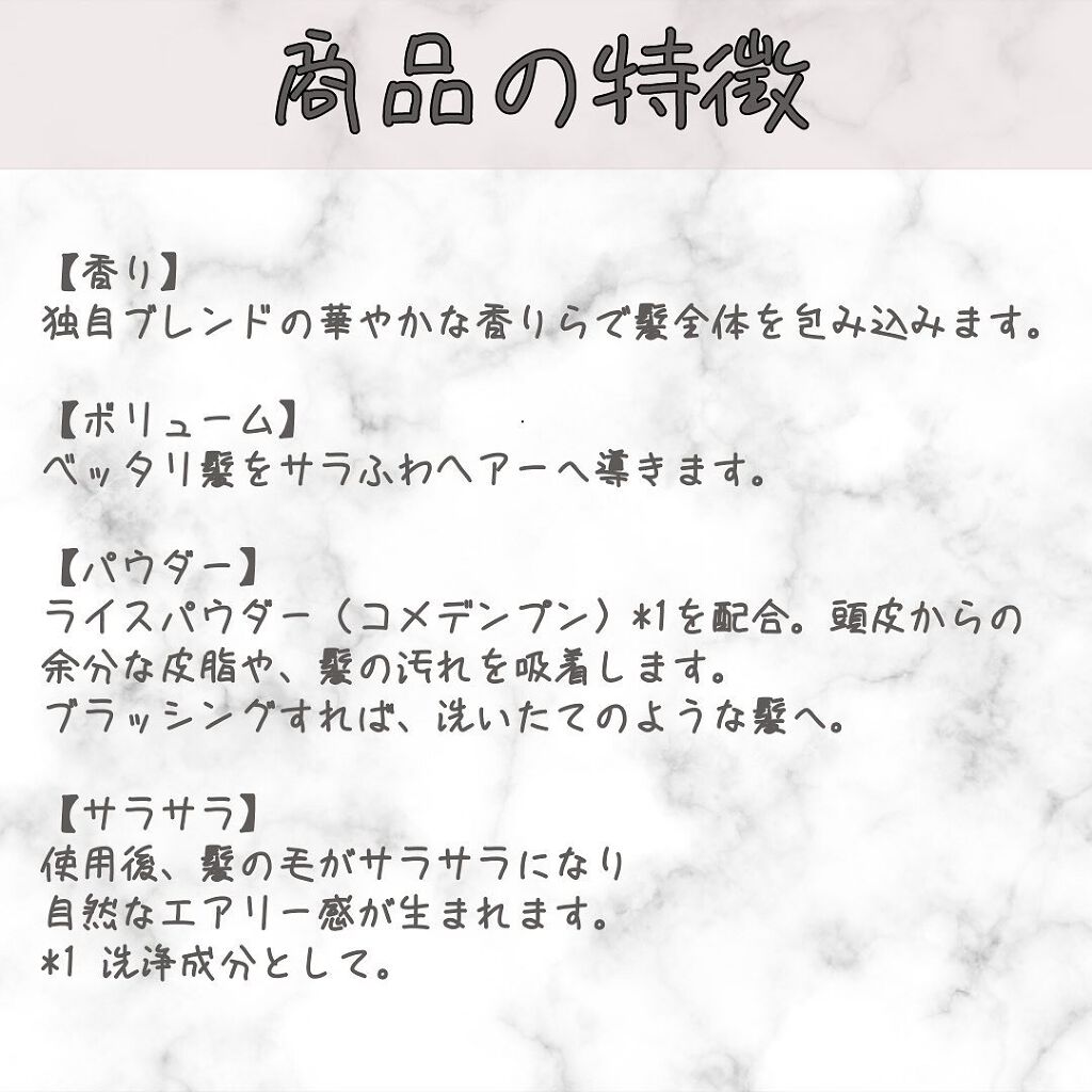 - チェリー<甘くキュートなチェリーの香り> 独自ブレンドの華やかな香りによって髪の嫌なニオイをリフレッシュ。※3 ■香り 全4種類の独自ブレンドの華やかな香りで髪全体を包み込みます。 ■ボリューム ペッタリ髪をサラふわヘアーへ導きます。 ■パウダー ライスパウダー(コメデンプン※2)を配合。 頭皮から出た余分な皮脂や、髪の汚れを吸着します。ブラッシングすれば洗いたてのような髪へ。 ※2清浄成分として ※3 マスキング効果による