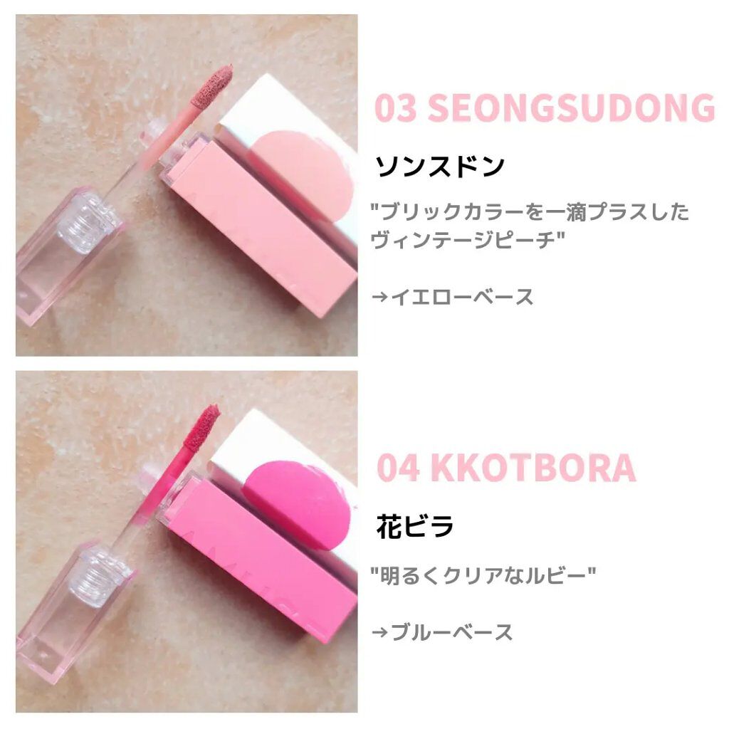 - <01モモシュー> ジメチコン、トリメチルシロキシケイ酸、ジメチコンクロスポリマー、リンゴ酸ジイソステアリル、カプリリルメチコン、トリベヘニン、酸化チタン、トリイソステアリン酸ポリグリセリル-2、加水分解ヒアルロン酸、イソステアリン酸ソルビタン、(ビニルジメチコン/メチコンシルセスキオキサン)クロスポリマー、イソドデカン、ポリヒドロキシステアリン酸、水添ポリシクロペンタジエン、パルミチン酸エチルヘキシル、ミリスチン酸イソプロピル、イソステアリン酸、レシチン、オクチルドデカノール、ジイソステアリン酸ポリグリセリル-2、ポリリシノレイン酸ポリグリセリル-3、酢酸トコフェロール、水、グリセリン、トリ(カプリル酸/カプリン酸)グリセリル、水添レシチン、セラミドNP、ステアロイルグルタミン酸Na、デヒドロ酢酸、香料、酸化鉄、黄4、赤202 <02シュシュ> ジメチコン、トリメチルシロキシケイ酸、ジメチコンクロスポリマー、カプリリルメチコン、トリベヘニン、リンゴ酸ジイソステアリル、酸化チタン、トリイソステアリン酸ポリグリセリル-2、酸化鉄、加水分解ヒアルロン酸、イソステアリン酸ソルビタン、(ビニルジメチコン/メチコンシルセスキオキサン)クロスポリマー、イソドデカン、ポリヒドロキシステアリン酸、水添ポリシクロペンタジエン、パルミチン酸エチルヘキシル、ミリスチン酸イソプロピル、イソステアリン酸、レシチン、オクチルドデカノール、ジイソステアリン酸ポリグリセリル-2、ポリリシノレイン酸ポリグリセリル-3、酢酸トコフェロール、水、グリセリン、トリ(カプリル酸/カプリン酸)グリセリル、水添レシチン、セラミドNP、ステアロイルグルタミン酸Na、デヒドロ酢酸、香料、黄4、赤202 <03ソンスドン> ジメチコン、トリメチルシロキシケイ酸、ジメチコンクロスポリマー、カプリリルメチコン、トリベヘニン、リンゴ酸ジイソステアリル、酸化チタン、トリイソステアリン酸ポリグリセリル-2、加水分解ヒアルロン酸、イソステアリン酸ソルビタン、(ビニルジメチコン/メチコンシルセスキオキサン)クロスポリマー、イソドデカン、ポリヒドロキシステアリン酸、水添ポリシクロペンタジエン、パルミチン酸エチルヘキシル、ミリスチン酸イソプロピル、イソステアリン酸、レシチン、オクチルドデカノール、ジイソステアリン酸ポリグリセリル-2、ポリリシノレイン酸ポリグリセリル-3、酢酸トコフェロール、水、グリセリン、トリ(カプリル酸/カプリン酸)グリセリル、水添レシチン、セラミドNP、ステアロイルグルタミン酸Na、デヒドロ酢酸、香料、酸化鉄、黄5、赤202 <04花ビラ> ジメチコン、トリメチルシロキシケイ酸、ジメチコンクロスポリマー、カプリリルメチコン、トリベヘニン、リンゴ酸ジイソステアリル、赤202、ジイソステアリン酸ポリグリセリル-2、加水分解ヒアルロン酸、イソステアリン酸ソルビタン、(ビニルジメチコン/メチコンシルセスキオキサン)クロスポリマー、イソドデカン、トリイソステアリン酸ポリグリセリル-2、ポリヒドロキシステアリン酸、水添ポリシクロペンタジエン、パルミチン酸エチルヘキシル、ミリスチン酸イソプロピル、イソステアリン酸、レシチン、オクチルドデカノール、ポリリシノレイン酸ポリグリセリル-3、酢酸トコフェロール、水、グリセリン、トリ(カプリル酸/カプリン酸)グリセリル、水添レシチン、セラミドNP、ステアロイルグルタミン酸Na、デヒドロ酢酸、香料、酸化鉄、酸化チタン、赤230(1) <05ミルクティー> ジメチコン、トリメチルシロキシケイ酸、ジメチコンクロスポリマー、カプリリルメチコン、トリベヘニン、リンゴ酸ジイソステアリル、酸化チタン、トリイソステアリン酸ポリグリセリル-2、酸化鉄、加水分解ヒアルロン酸、イソステアリン酸ソルビタン、(ビニルジメチコン/メチコンシルセスキオキサン)クロスポリマー、イソドデカン、ポリヒドロキシステアリン酸、水添ポリシクロペンタジエン、パルミチン酸エチルヘキシル、ミリスチン酸イソプロピル、イソステアリン酸、レシチン、オクチルドデカノール、ポリリシノレイン酸ポリグリセリル-3、酢酸トコフェロール、ジイソステアリン酸ポリグリセリル-2、水、グリセリン、トリ(カプリル酸/カプリン酸)グリセリル、水添レシチン、セラミドNP、ステアロイルグルタミン酸Na、デヒドロ酢酸、香料、赤202、赤227 <06ソウルローズ> ジメチコン、トリメチルシロキシケイ酸、ジメチコンクロスポリマー、カプリリルメチコン、トリベヘニン、リンゴ酸ジイソステアリル、トリイソステアリン酸ポリグリセリル-2、酸化チタン、酸化鉄、加水分解ヒアルロン酸、イソステアリン酸ソルビタン、(ビニルジメチコン/メチコンシルセスキオキサン)クロスポリマー、イソドデカン、ポリヒドロキシステアリン酸、水添ポリシクロペンタジエン、パルミチン酸エチルヘキシル、ミリスチン酸イソプロピル、イソステアリン酸、レシチン、ジイソステア