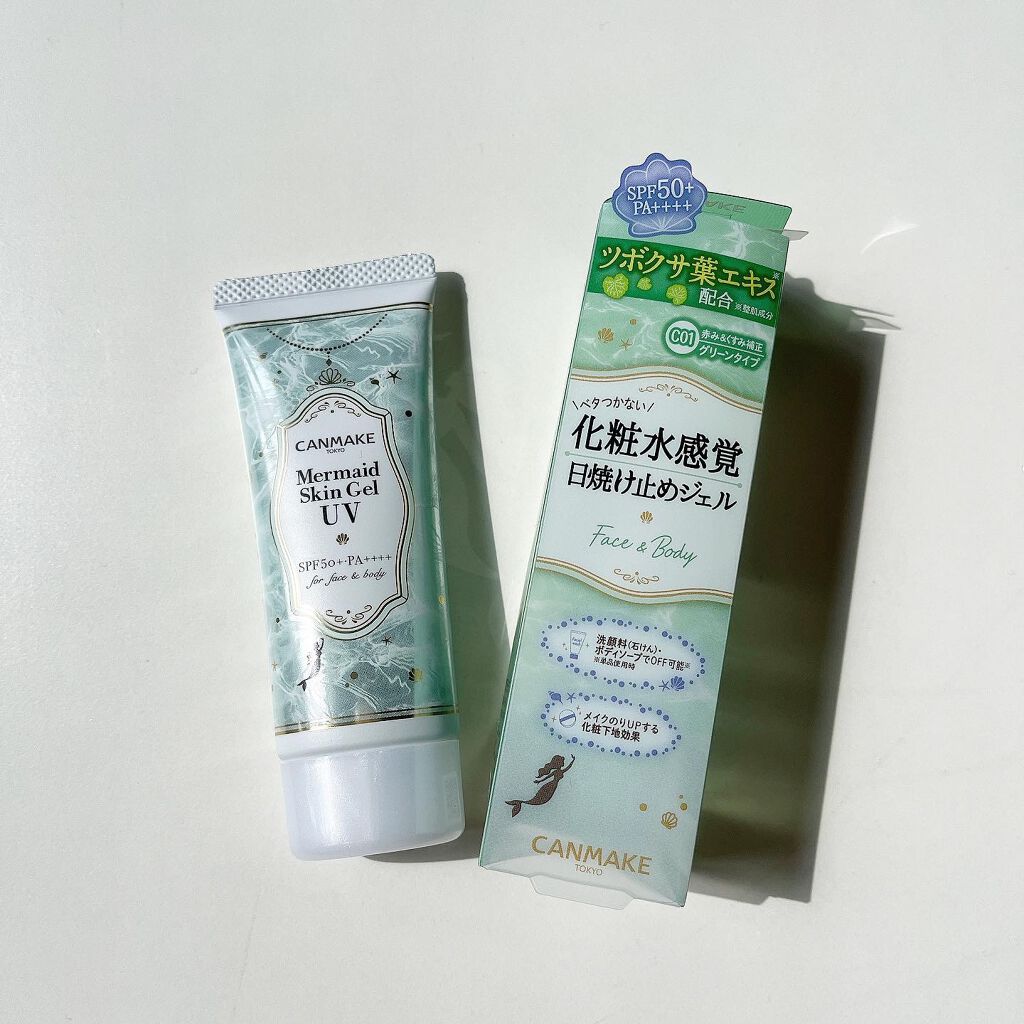 キャンメイク マーメイドスキンジェルUVC01CICAミント赤みやくすみを補正するグリーン下地💚🐚SPF50+PA++++🏖️みずみずしいテクスチャーで伸びが良くて使いやすい❕グリーン系の下地が欲しかったのもあるけどパッケージが可愛くて💕洗顔...