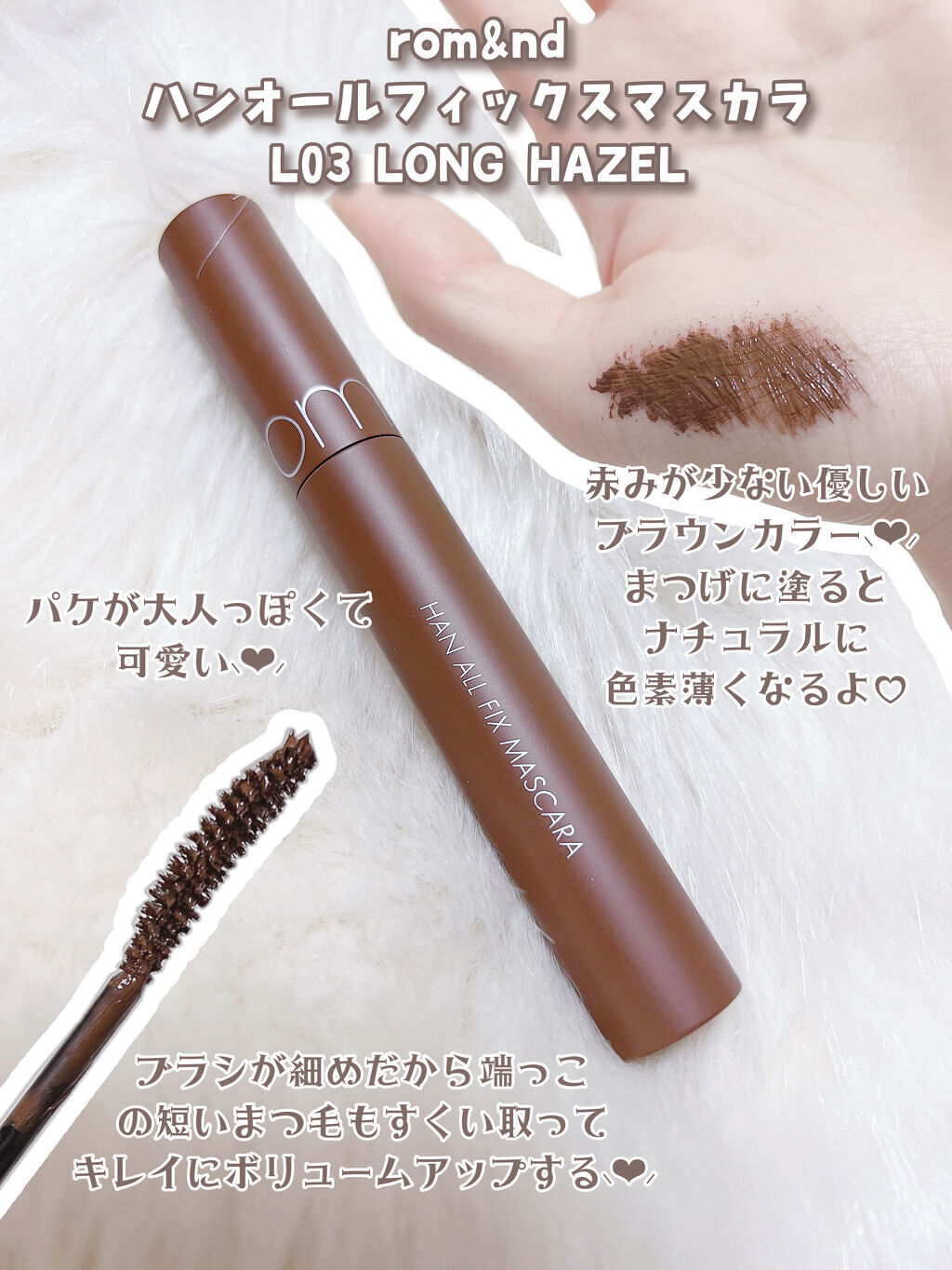 上品で長く美しいまつ毛に仕上げる✼••┈┈••✼••┈┈••✼••┈┈••✼••┈┈••✼《rom&nd》ロムアンHAフィックスマスカラLO3ロングヘーゼル☑️まつ毛1本1本キレイにセパレート☑️塗った瞬間、上向きカールを固定☑️だまになりに...