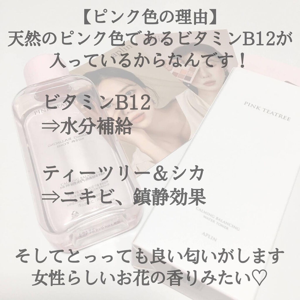 ティーツリーやツボクサ成分(CICA)が配合されているトナー.′.′ ピンク色でふんわりお花みたいなかわいらしい香りです🌷˒˒* このピンク色は自然成分[ビタミンB12]の本来の色で、ビタミンB12は荒れた肌に水分と活力を与え肌環境を整えてくれるんだって✨✨ セラミドNPやアラントインなどの成分が入っていて、保湿と肌荒れ予防を同時にケアしたい人に◎