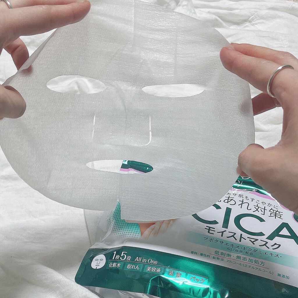 - カサカサ肌もすこやかに 肌あれ対策のCICAモイストマスク! 1.毎日の肌あれケアに。CICAケア オールインワンマスク みずみずしいタッチの美容液が角層奥のすみずみまでゆきわたり、ダメージを受けやすい肌もしっかり保湿。 肌あれトラブルを防ぎます。 1品5役:化粧水+収れん+美容液+乳液+パック 2 肌の調子をととのえ、うるおいバリアをサポート 毎日使っても負担感の少ないやさしい使い心地。角層内部の水分・油分のバランスをととのえ、すこやかな肌をキープします。 3 やわらかさと密着感を兼ね備えたなめらかシート 超極細繊維を使ったシートで肌をやさしく包みこみます。100%バイオマス由来のシートマスクで、 環境により配慮した素材を使用しています。