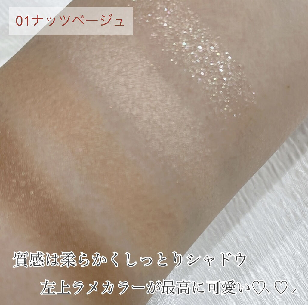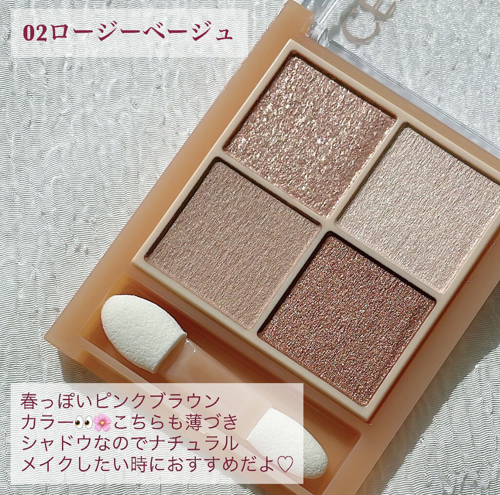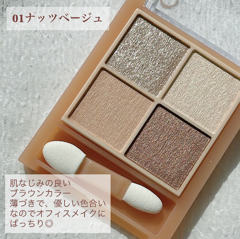 - ラメ・パール・マット3質感の4色アイシャドウ。 肌馴染みの良いベージュを基調としたカラー。ラメ・パール・マットの3質感を重ねて、自然にまぶたを強調し奥行のある大きな目元へ。 しっとり溶け込むような柔らかなパウダーなので、スルスル伸びてまぶたにピタッと密着。保湿成分(スクワラン・ホホバ種子油)配合。